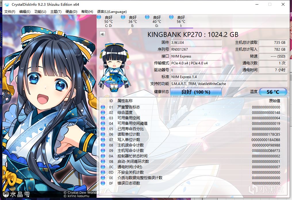 金百达KP270支持 Ple 4.0 x4|PCle 4.0 x4传输模式、NVM Express 1.4标准,支持S.M.A.R.T.、TRIM、VolatileWriteCache功能。如果看到自己的固态硬盘跟商品介绍没有异常,那么就可以进行性能测试了。
