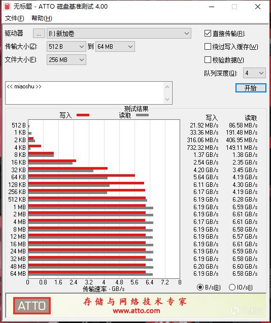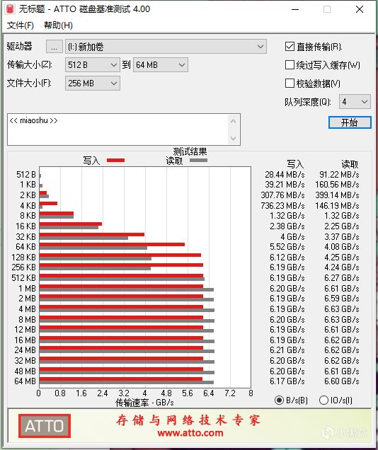 使用ATTO 磁盘基准测试软件对小文件和大文件进行读写速度测试