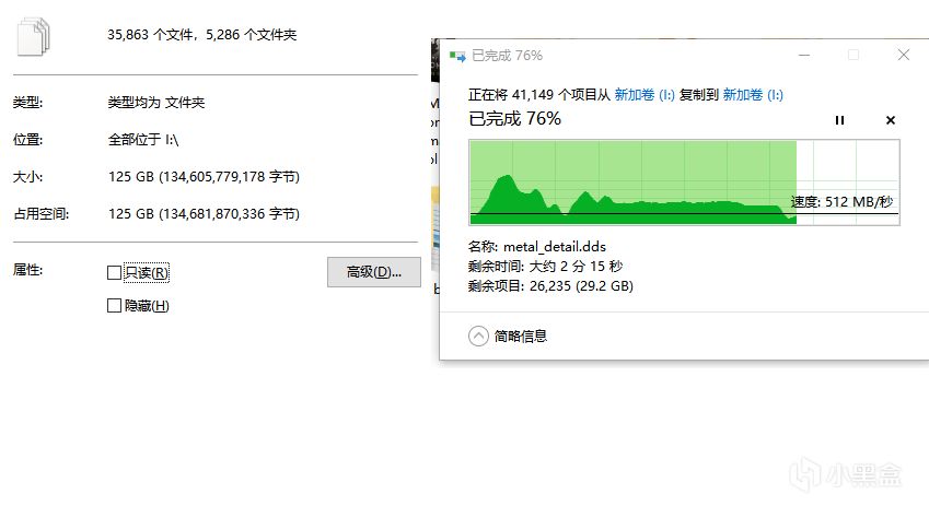 将35863个文件,5286个文件夹共125GB的文件在本盘中进行复制操作,需要3分15秒即可传输完毕。