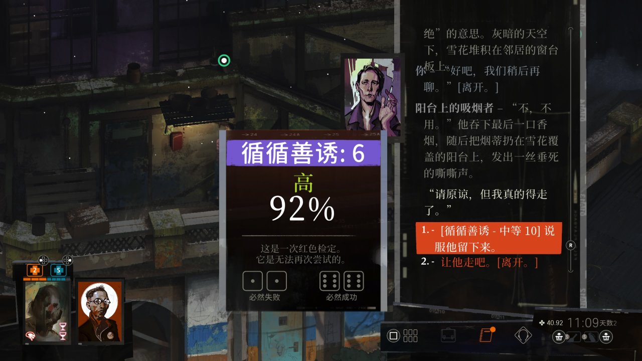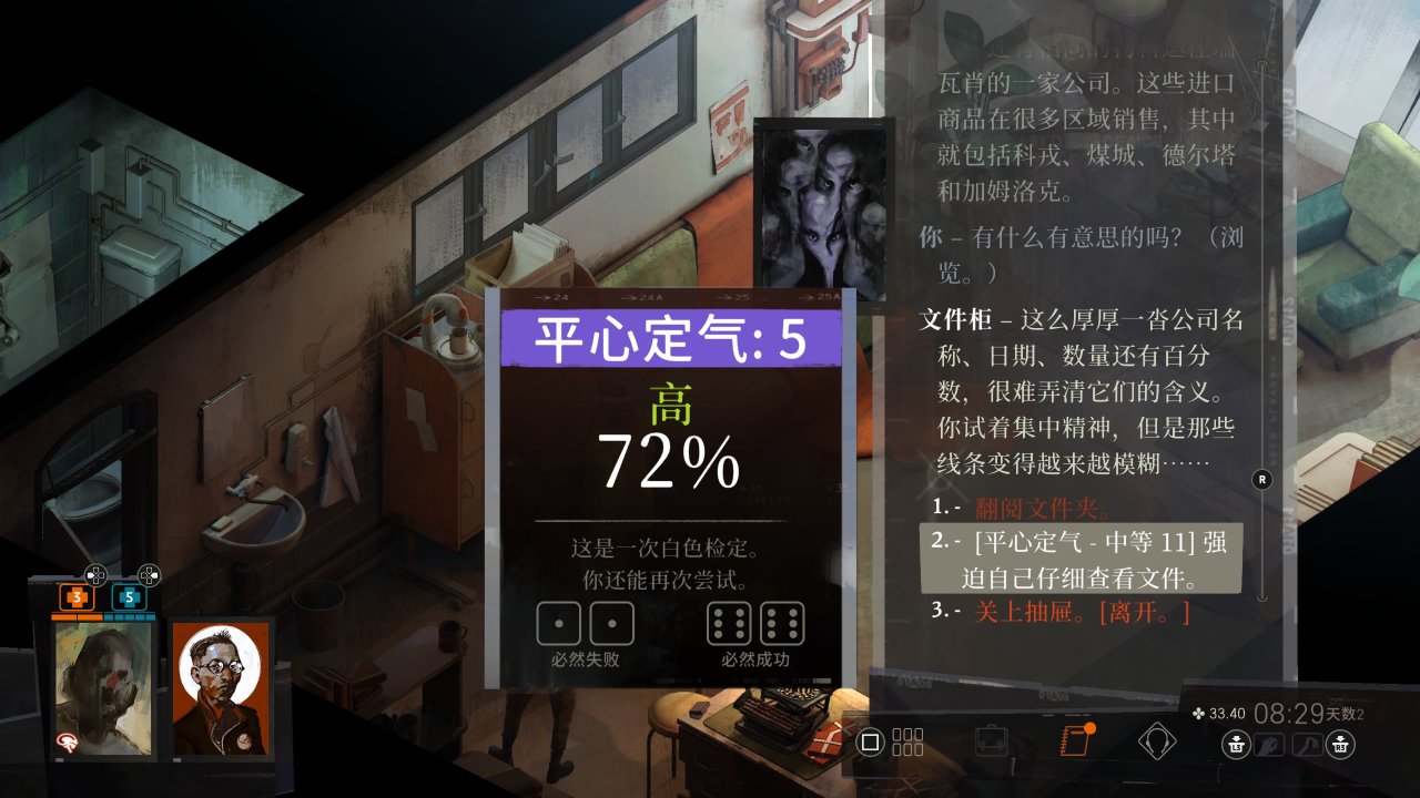 准备就绪进会长办公室见艾弗拉特,第一次强制对话,坐下后过程中扣血后记得及时补,可以选择拿走它那张巨大滑稽的支票(只有药店可以卖25雷亚尔)但全程不要说谢谢,这里从容自若检定基本是必失败的无所谓,强制对话完选后院吊人调查相关,接公寓后院地下室调查任务(前三天限定)