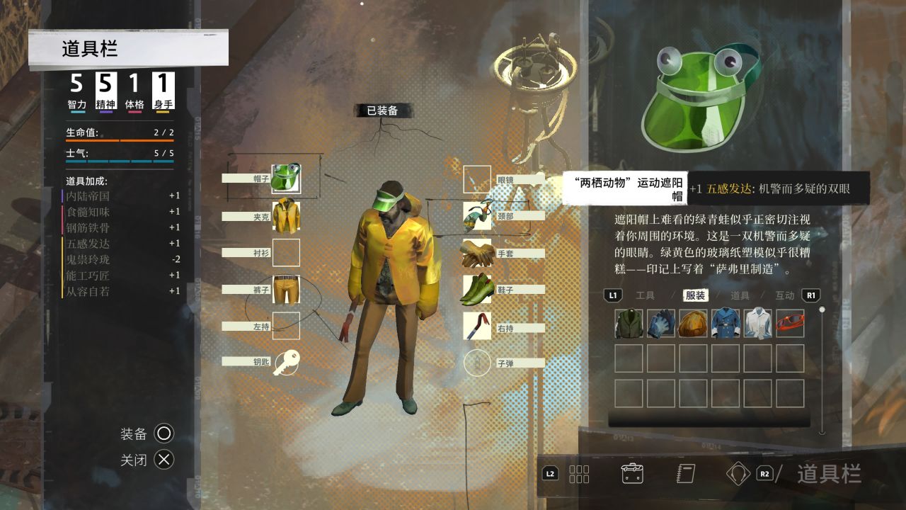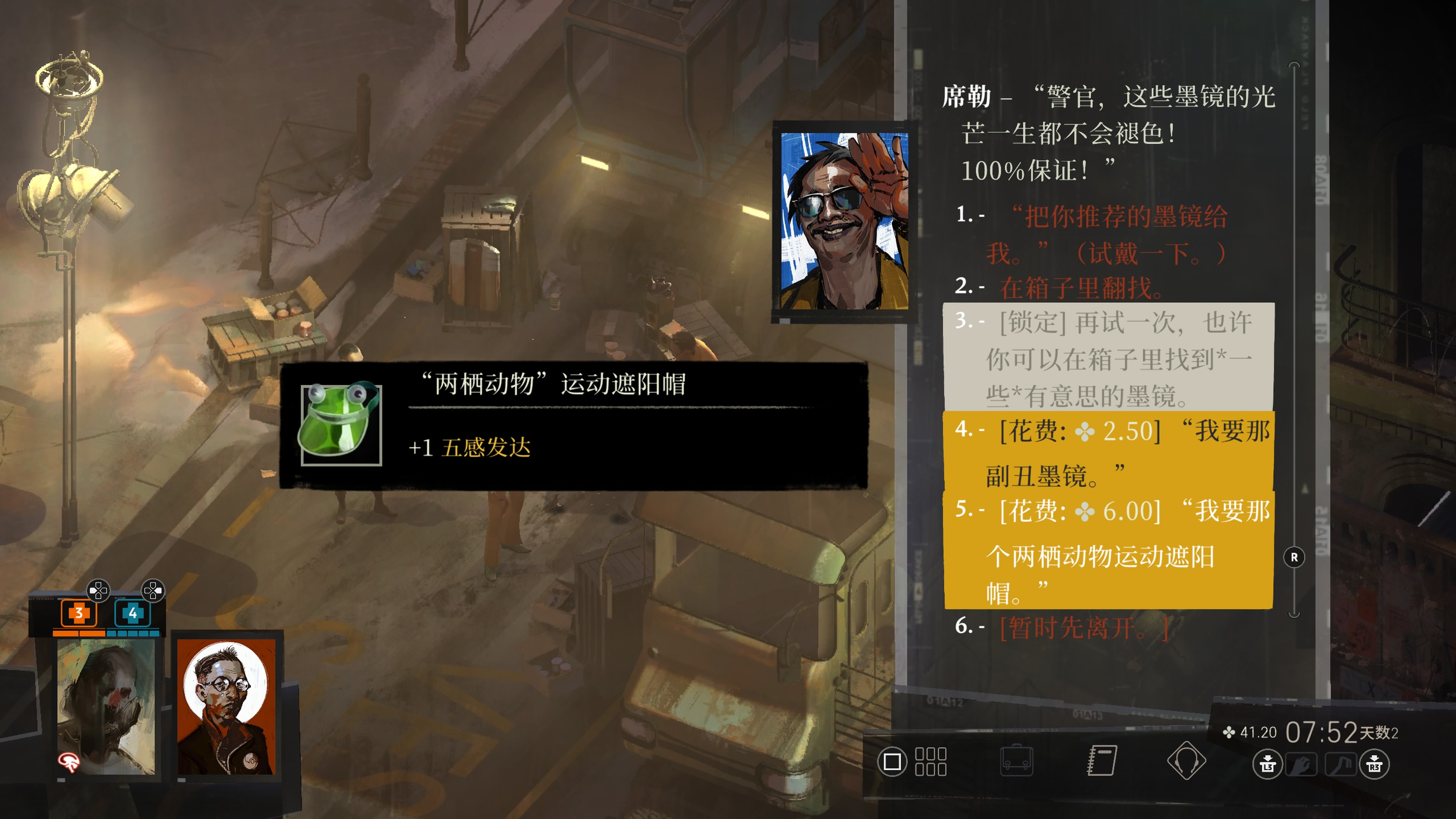 和金对话,餐厅出现提图斯一伙可以暂时不用管,目前还未做过任何调查,没什么值得对话的内容,出旅馆去下方席勒小摊贩处把第一天翻箱出来的自杀墨镜和两栖动物帽都买了,并把帽子装备上,把五感发达堆到2(仍然记得不要先对话席勒本人)