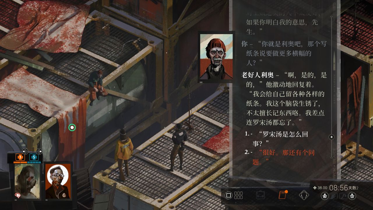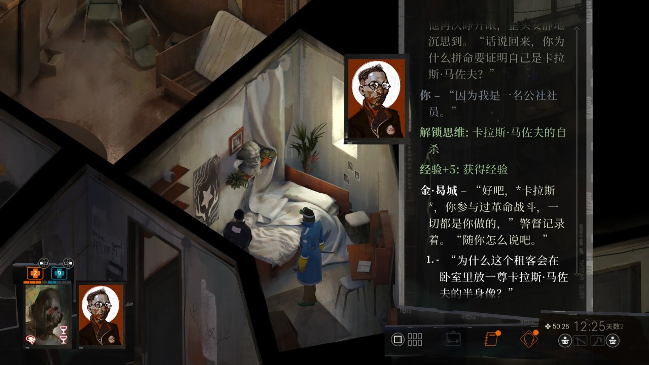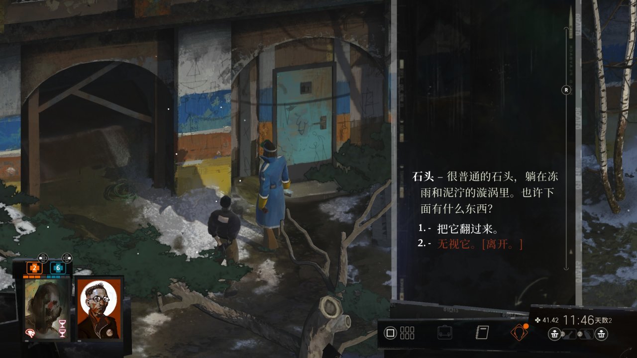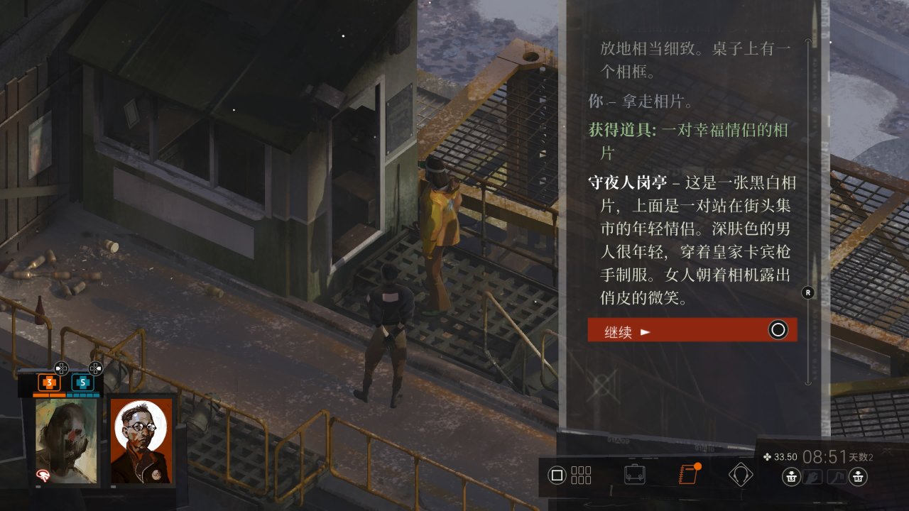 和书店下方弹坑处雷内和罗斯马雷两老人聊天,玩地掷球,把之前警务室找到情侣合影给连两人看听三角恋故事,度过第二天剩余的时间,期间记得喝酒药效过了及时补,与雷内的剧情对话务必在前四天完成,不涉及剧透就不提原因了,所以尽量不要拖到最后,这里对话会涉及大量四种主义言论,视对话选择可能获得各种对应思维和成就,但本流程不会使用不重要。