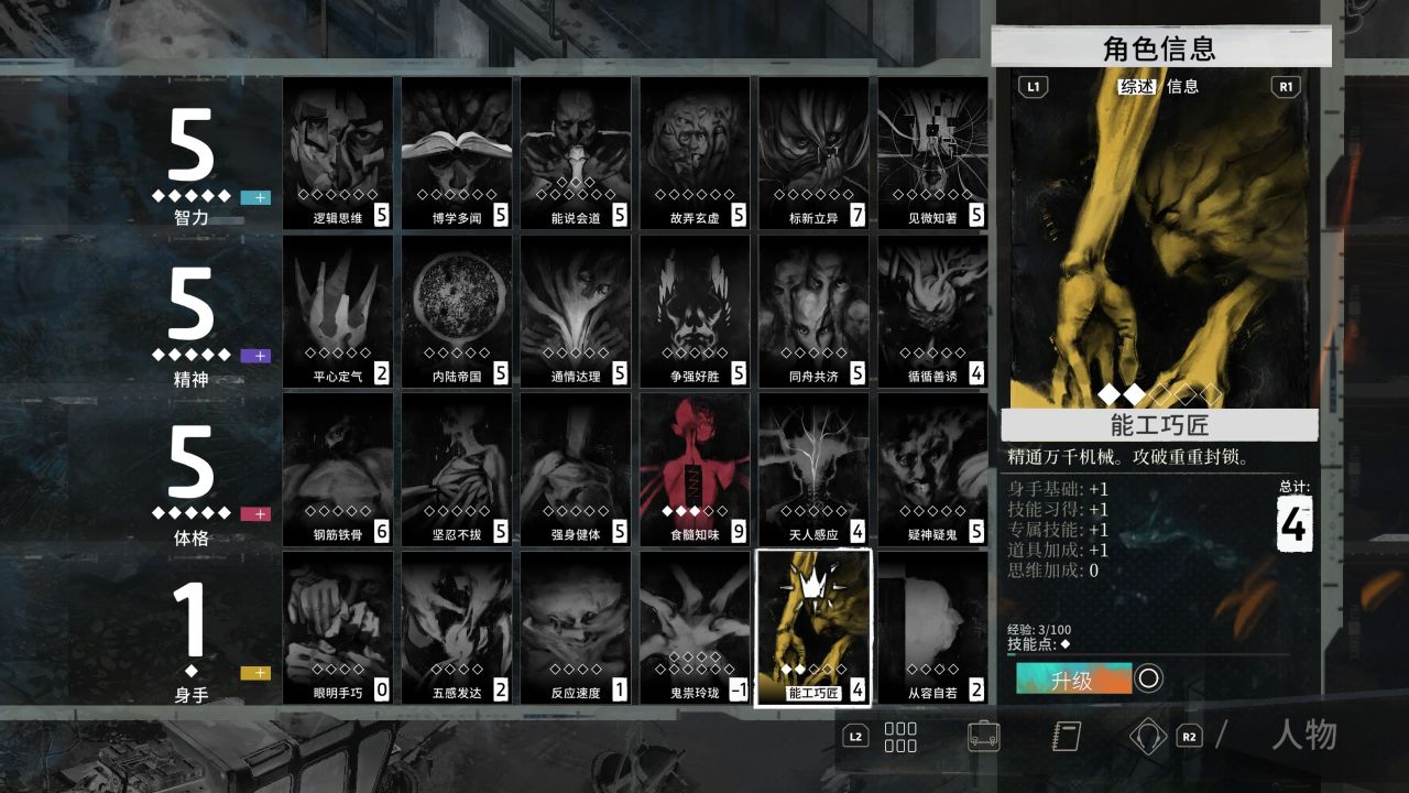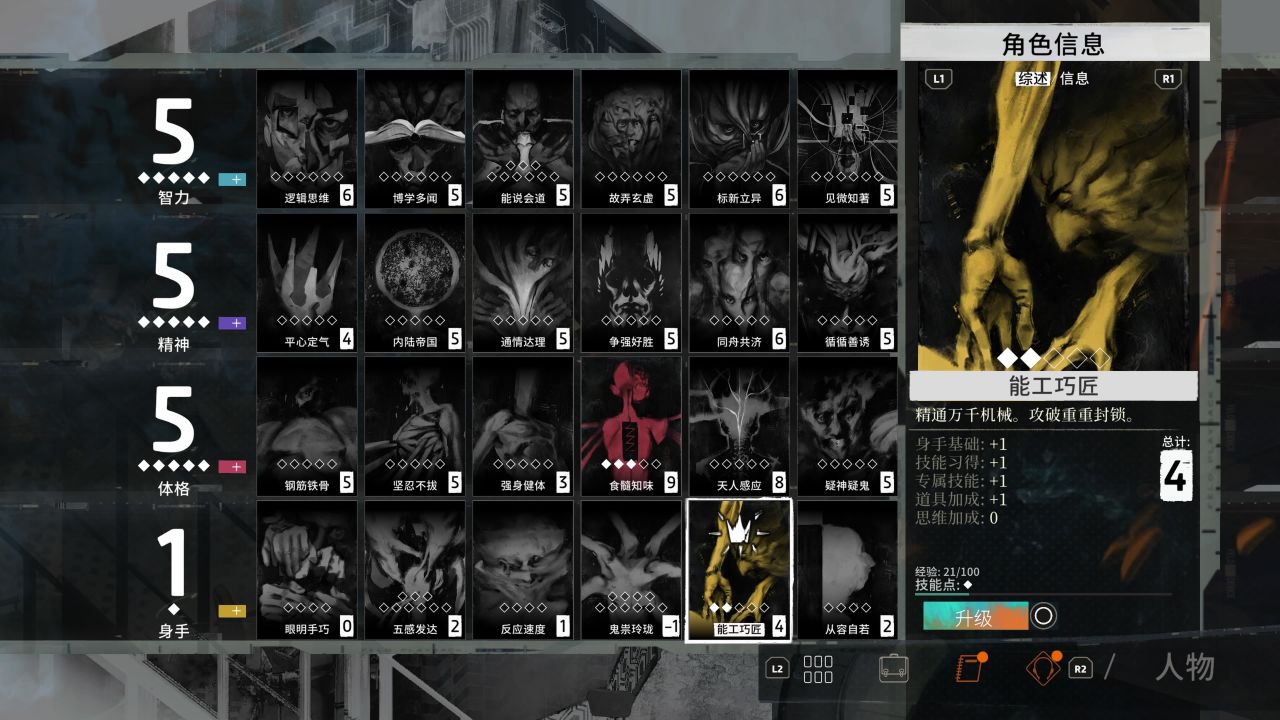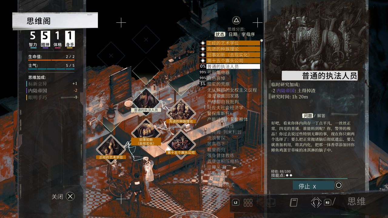 第二天能达成的技能面板和思维阁如下: