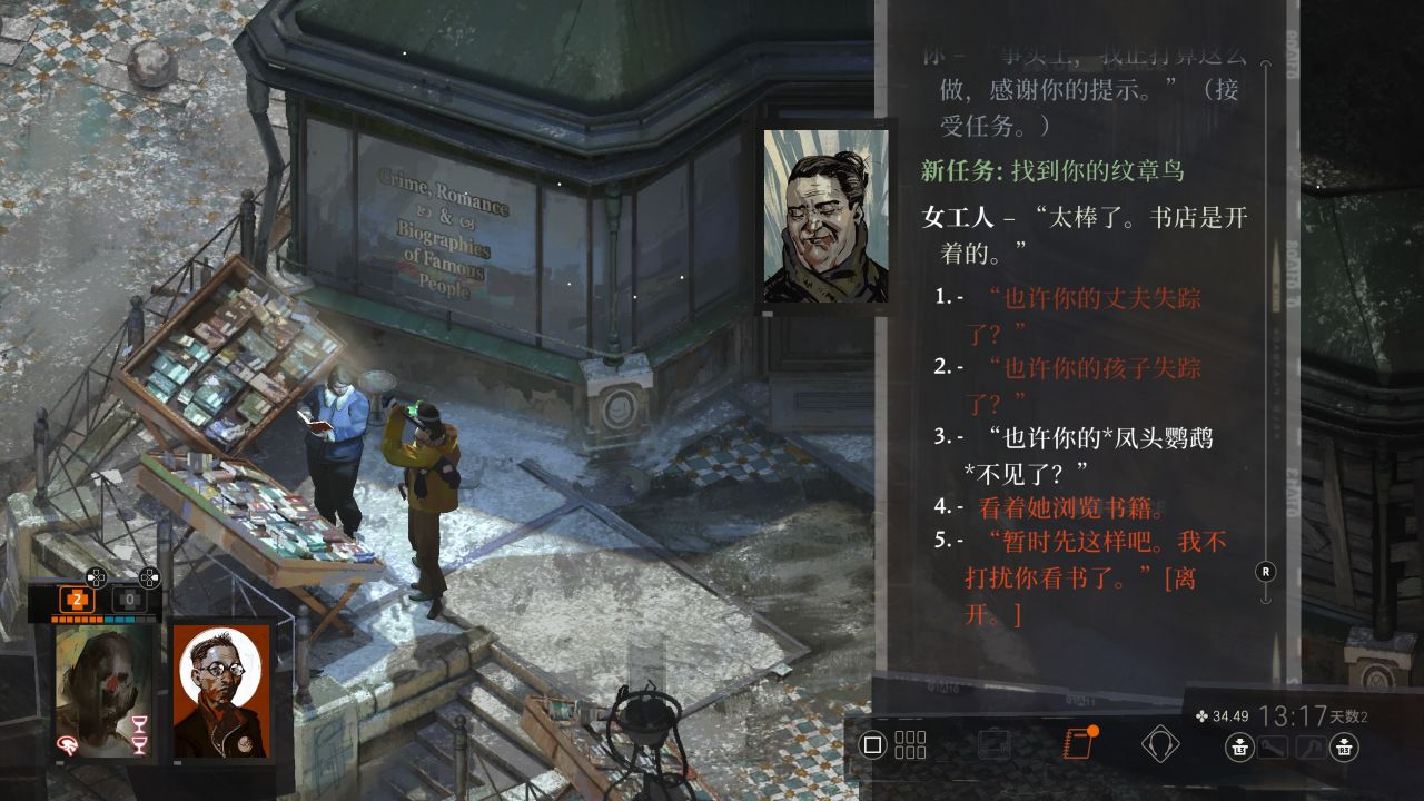 去书店门口和女工人对话接丈夫失踪案和触发任务找寻纹章鸟。