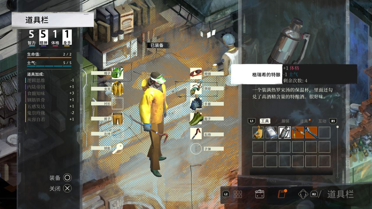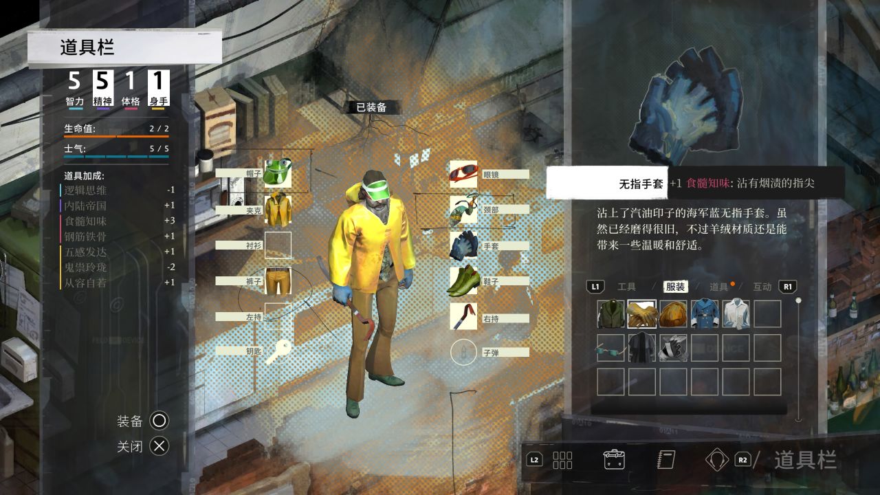 从码头办公室出来后,对话楼梯处马列拉拿地下室钥匙,装备上之前当铺门口垃圾箱获得无指手套和自杀墨镜,此时思维普通的执法人员应该已经内化完成,且至少有3个技能点,加3点食髓知味,配合现在这身装备可以把食髓知味堆到7。