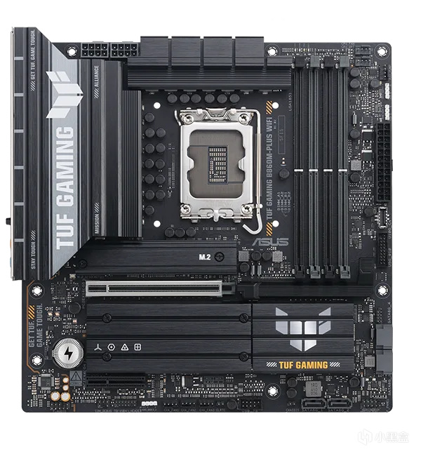 華碩TUF系列素以軍工級紮實耐用著稱,這款TUFGAMING B860M-PLUS WIFI亦延續經典基因。外觀以深邃黑色爲基底,輔以白色與明黃色的品牌標識及線條勾勒,整體設計摒棄繁複裝飾,以簡約利落的線條勾勒出硬朗風格,搭配TUF標誌性的黃色元素點綴,又通過金屬質感的細節處理營造出低調奢華的視覺體驗。