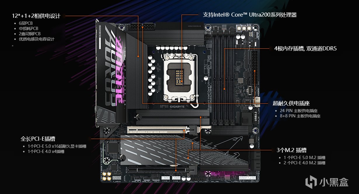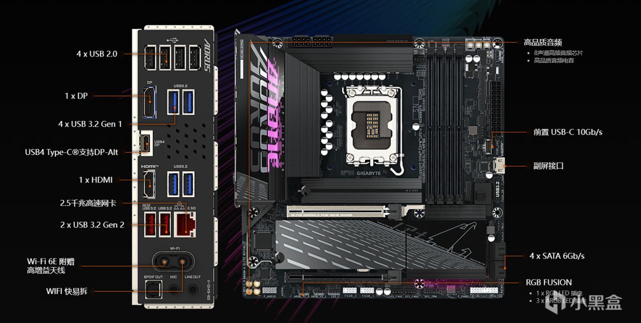 黑色PCB基底搭配紫色IO裝甲點綴,AORUS Logo 採用動態光效雕刻工藝,在機箱側透場景中呈現漸變霓虹效果。與傳統機甲風主板不同,其散熱裝甲採用磨砂金屬與鏡面切割拼接工藝,IO擋板集成ARGB燈條同步接口,玩家能通過技嘉 RGB FUSION軟件進行自定義。