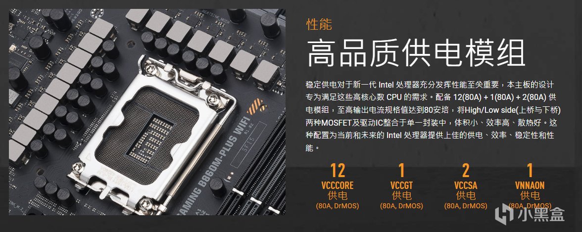 供電規格上,12+1+2+1相80A DrMOS豪華供電,同級別唯一配備80A大電流元件,在CPU高負載情況這是個不可忽視的點,但是英特爾B系芯片組又無法給CPU超頻,如果要使用帶K處理器,可以考慮這張主板。