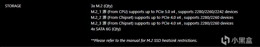 四張主板整體的拓展性基本沒有很大的區別,都帶有一條PCIe 5.0 x 16的顯卡插槽,和一個PCIe 4.0 x 4的拓展槽;M.2也都是3個且第一個支持PCIe 5.0 x 4。不過技嘉是裝甲全快拆,且全帶有散熱裝甲;微星缺少一個散熱裝甲;七彩虹和華碩則都還是擰螺絲。