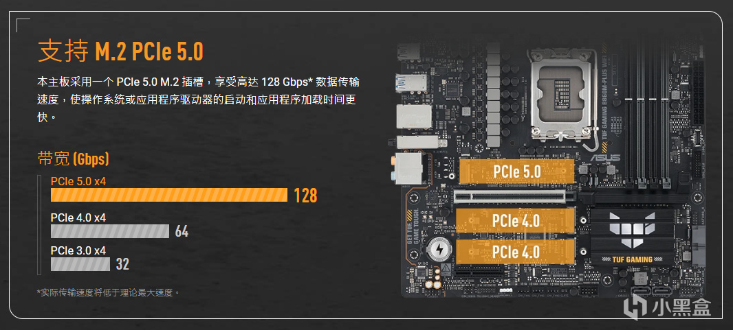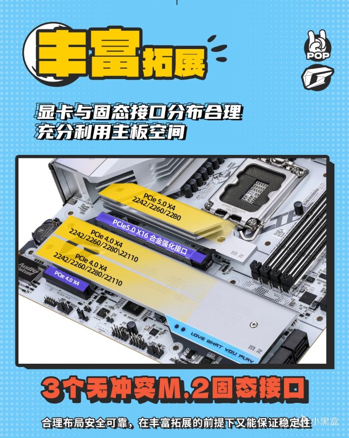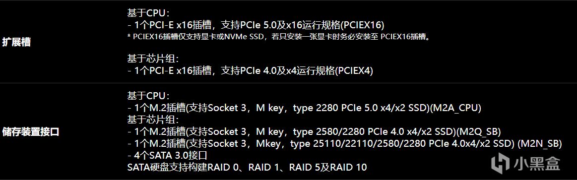拓展性方面,主板帶有一條PCIe 5.0×16的顯卡插槽,和一條PCIe 4.0 x 4的短插槽,可以額外添加各種各樣的外接設備,比如外接聲網卡以及再轉接一個M.2插槽,加上主板本身有3個M.2插槽,可以做到4個滿速無衝突的M.2。