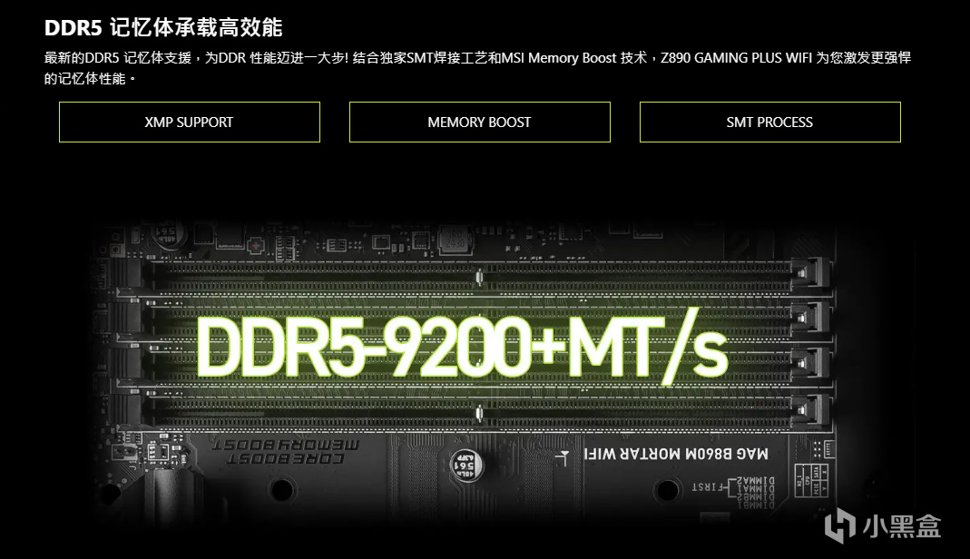 同樣有四條內存插槽,同樣支持 9200MT/s DDR5內存超頻,Memory Boost技術優化信號完整性,也能支持各種高頻內存。