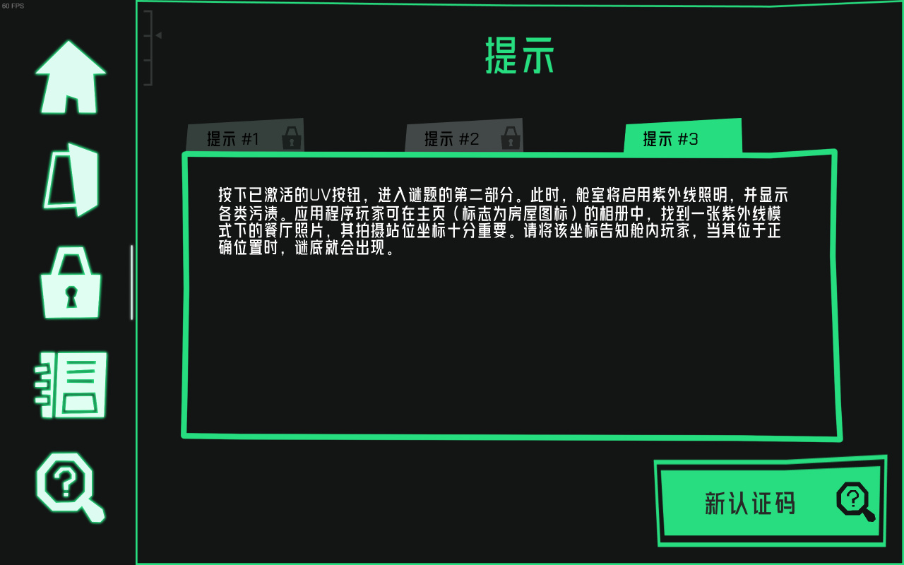 操作方需要找到线索卡,并使用线索卡在“提示设备”中解锁每个关卡的线索信息。消耗线索卡后,会出现一串字符,这些字符需要提供给手册方进行输入,以便查看提示线索。