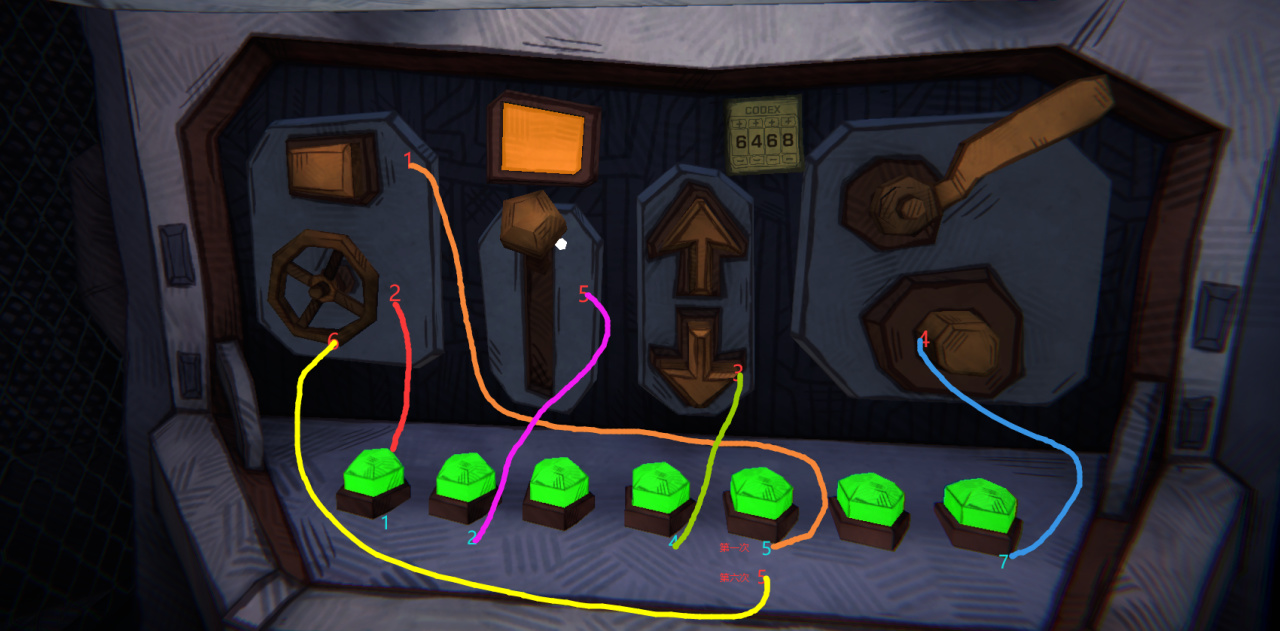 因为手册一方的维修画面包含七个图案和七个绿色按钮,需要操作方提供这些绿色按钮的正确前后顺序,手册方才能解开这一层谜题。