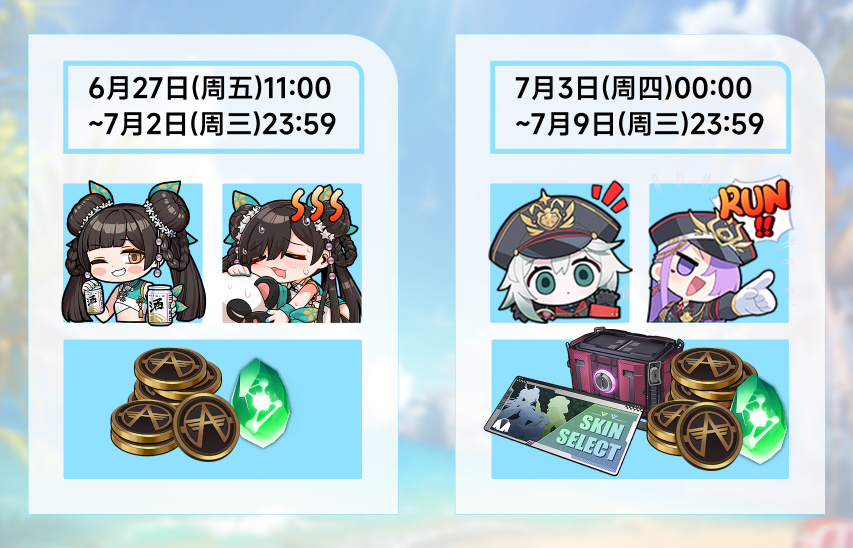 第一階段(6月27日11:00 - 7月2日23:59): 每日登錄可領 夏日主題【李黛琳】特別表情及遊戲資源。
