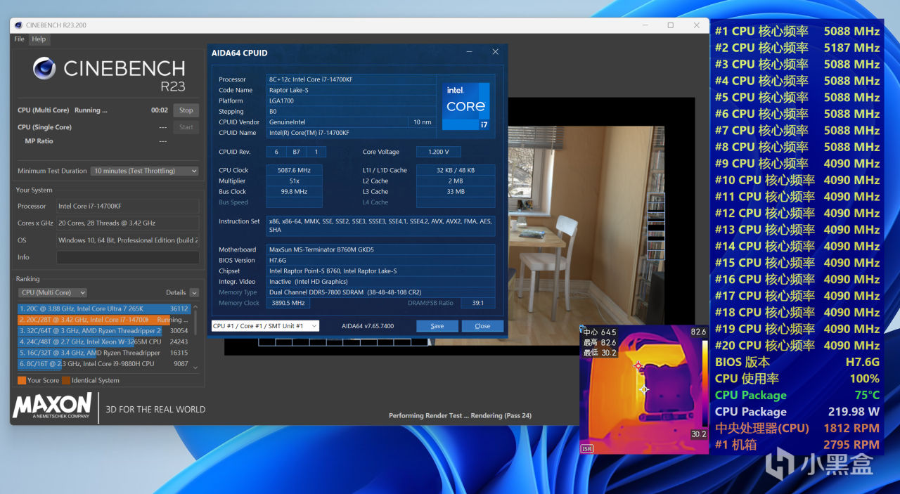 或许有看官觉得B760带不动14700KF,硬核也在30℃夏天室温,裸机平台无气流直吹环境进行了R23满载十分钟多核项目测试,可见14700KF全程可稳定5.08Ghz性能核+4.09Ghz能效核,CPU功耗约为220W,CPU温度在360水冷压制仅75℃,使用热成像仪监测主板供电区域为82.6℃,对于Dr.Mos这种整合封装元件来说简直太轻松了。
