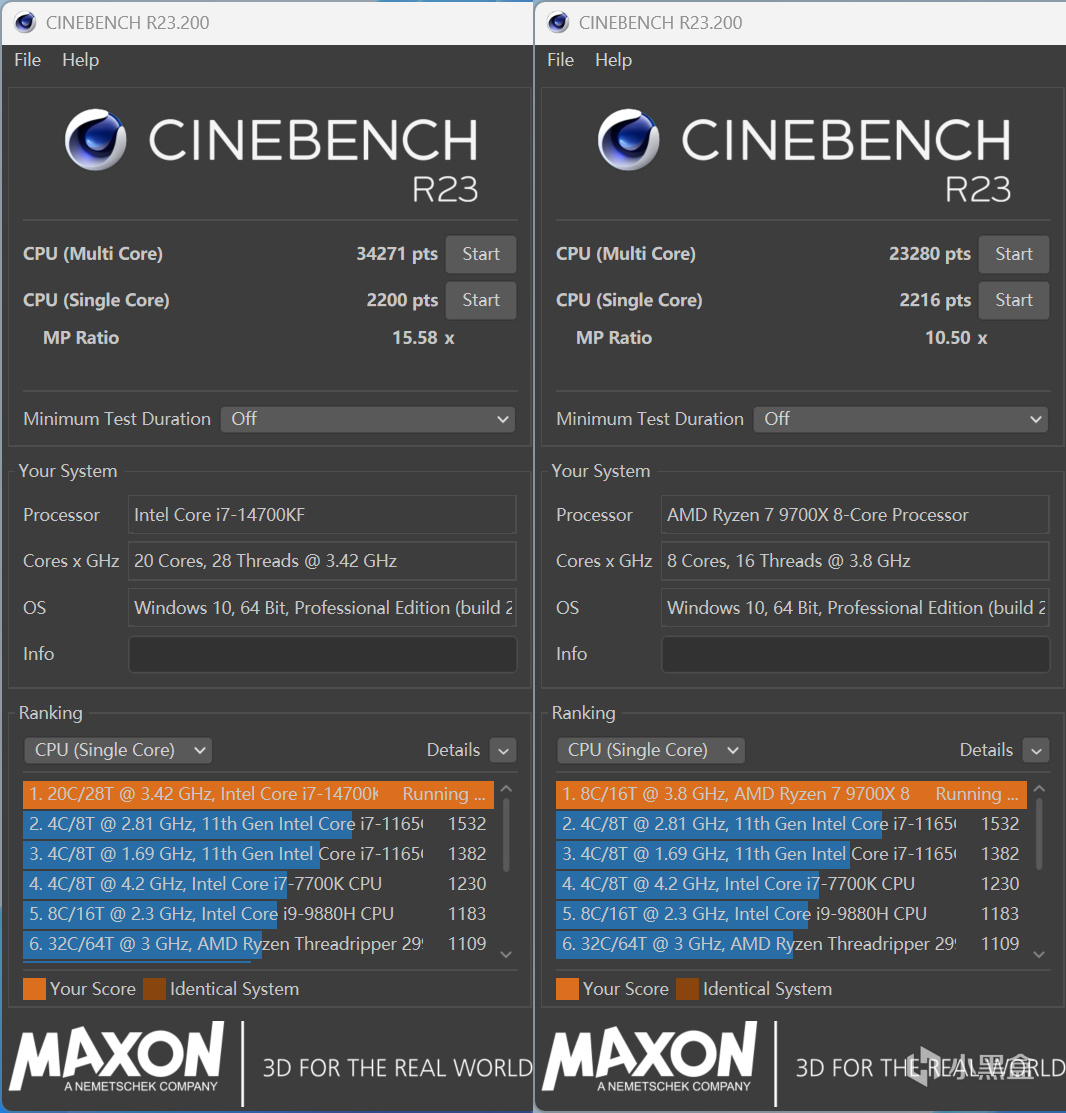 CINEBENCH R23,最具代表性的工业渲染项目之一,14700KF多核分数为34721 pts,单核分数为2200 pts,9700X多核分数为23280 pts,单核分数为2216 pts,堆效能核对于这种重度生产力场景确实优势不小,14700KF领先幅度差不多能达到50%,单核两者则是半斤八两。