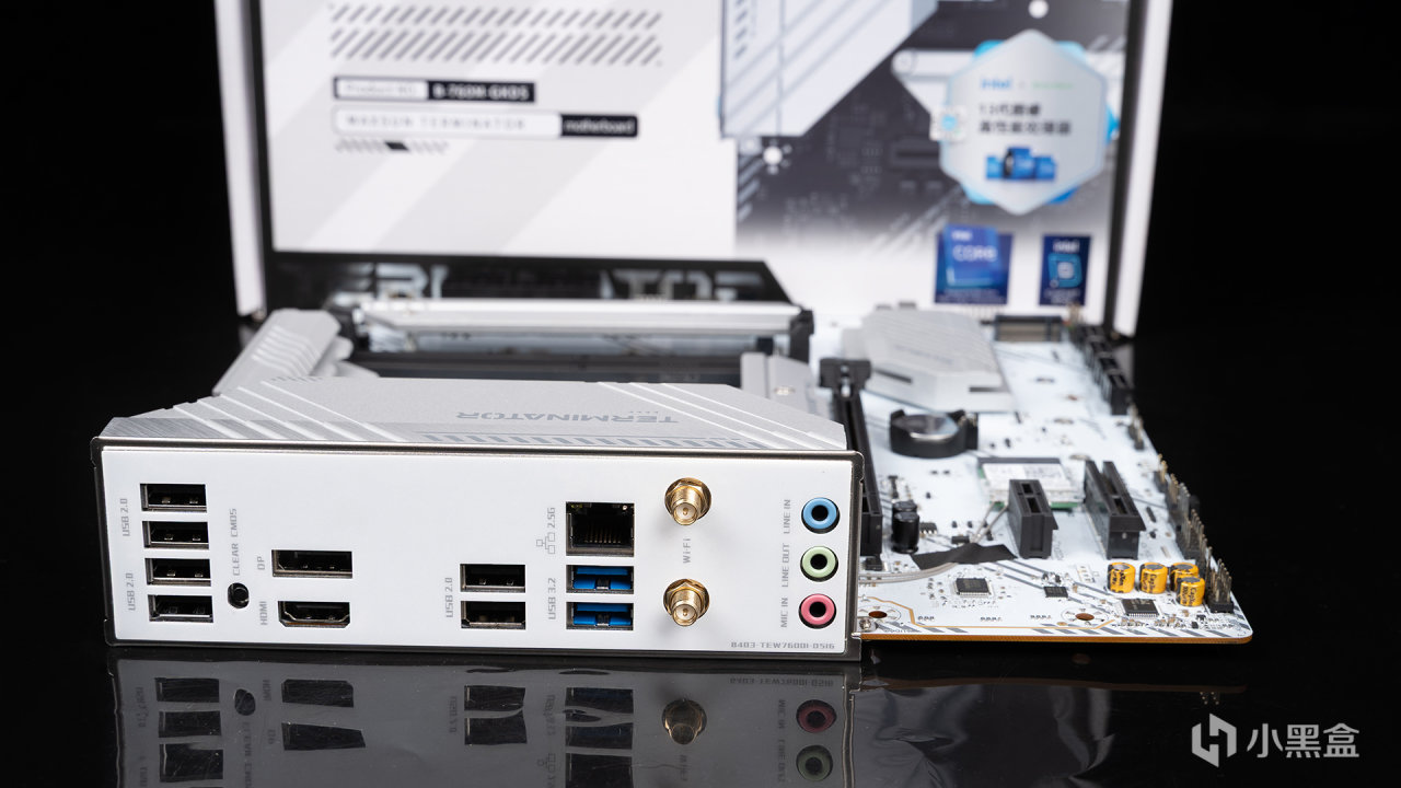 主板背部I/O一览,配备6*USB 2.0、CLR CMOS按钮、DP1.4、HDMI 2.0、2*USB 3.2 Gen 2 Type-A 10Gbps、2.5G有线网口、Wi-Fi6E和三组音频接口(ALC897驱动),总得来看USB接口数量是挺充裕的,扩展外设正合适,有CLR CMOS按钮对于这种高频内存主板也挺方便。