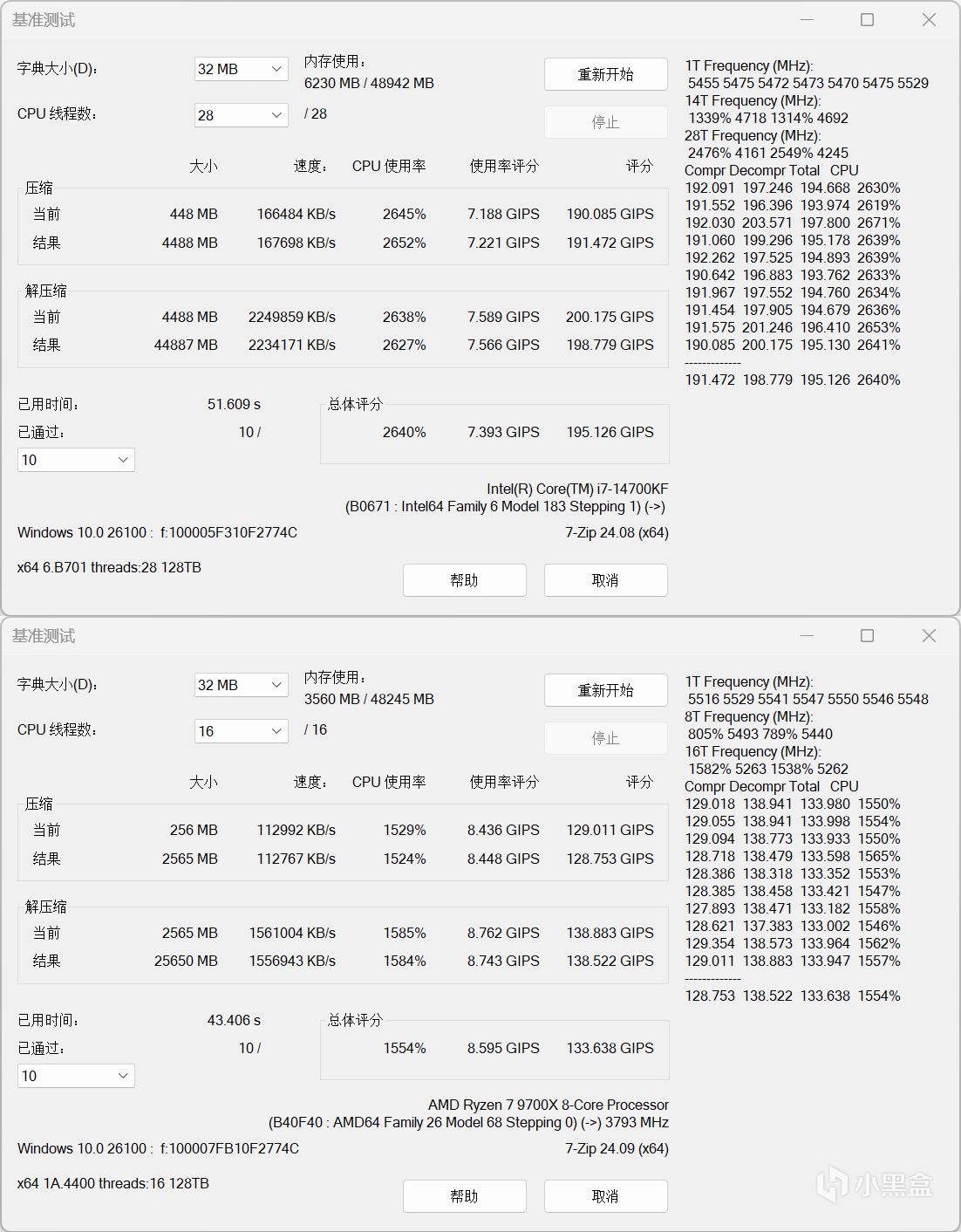 7-ZIP基准测试,14700KF压缩评分为191.472 GIPS,解压缩评分为198.779 GIPS,9700X压缩评分为128.753 GIPS,解压缩评分为138.522 GIPS。7-ZIP项目可代表日常解压缩文件的效率,压缩会更多关联内存性能,IPO技术达成的7800高频可带来可观的带宽性能,14700KF领先幅度高达50%,而解压缩性能更看重多线程规格,20核28线程的14700KF自然也更强有43%优势。