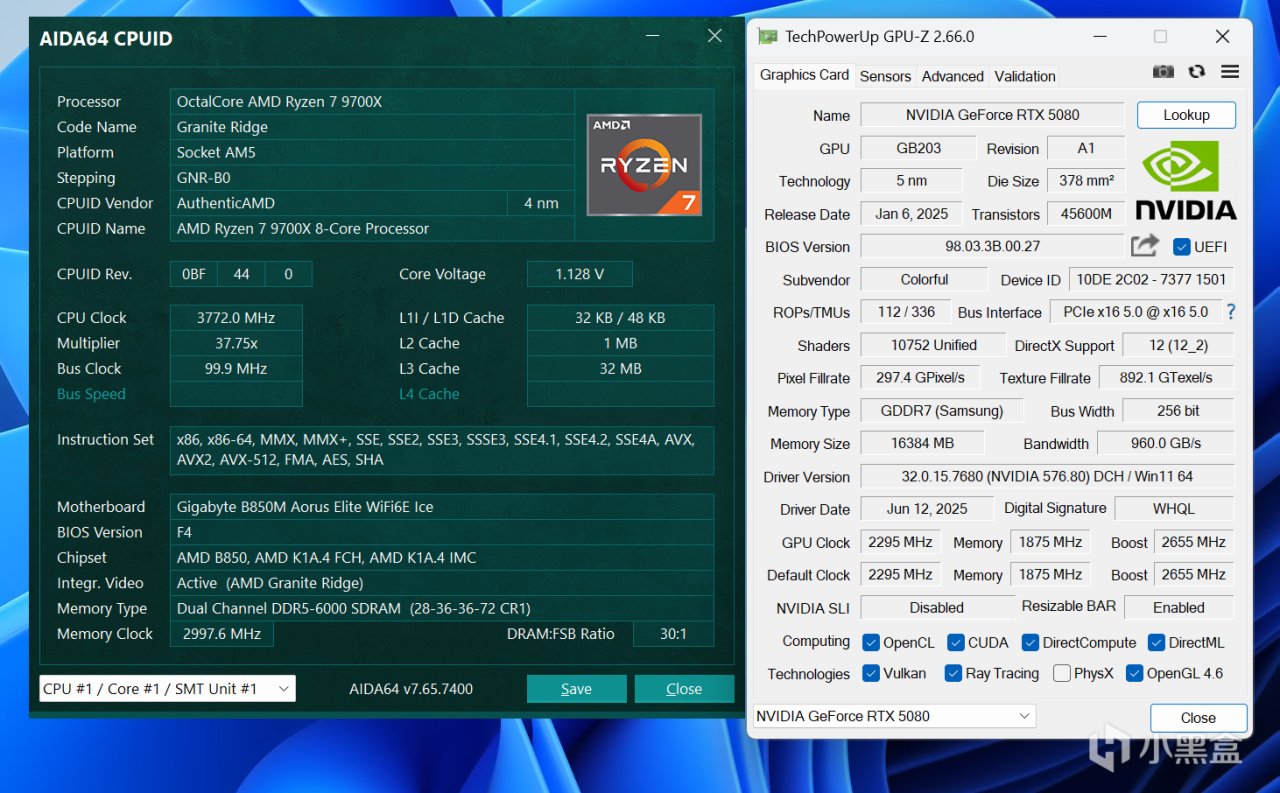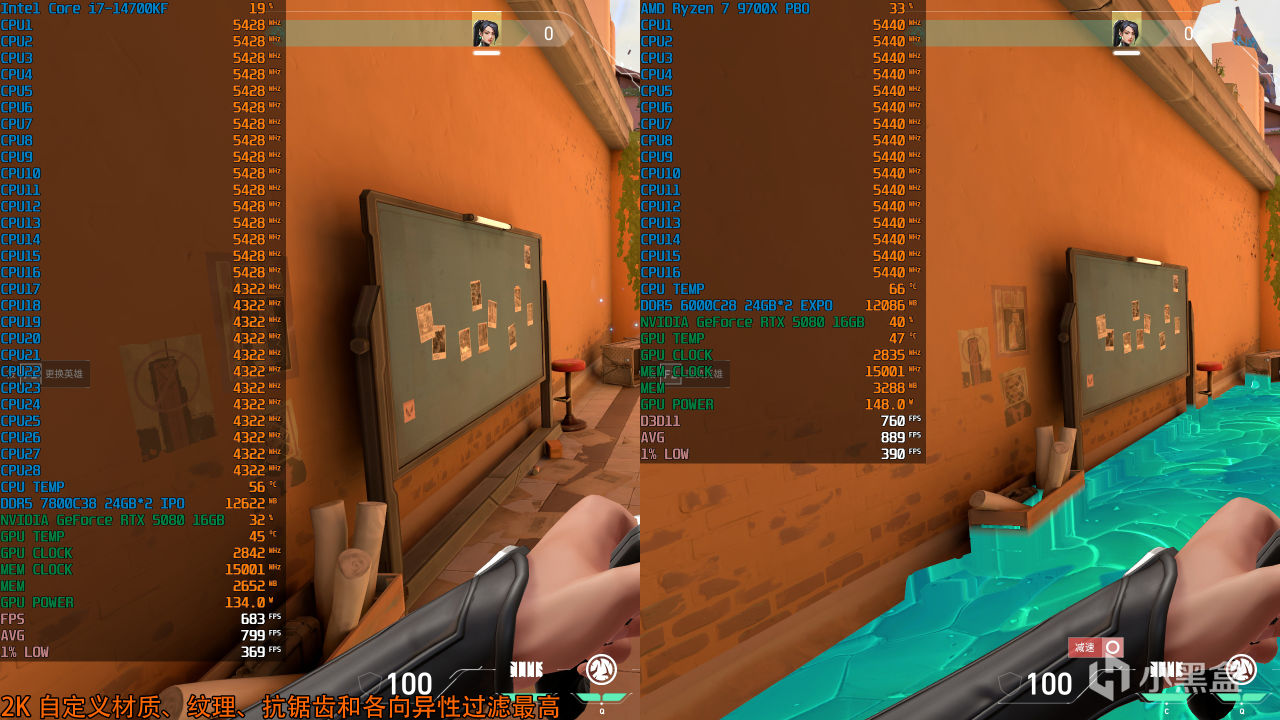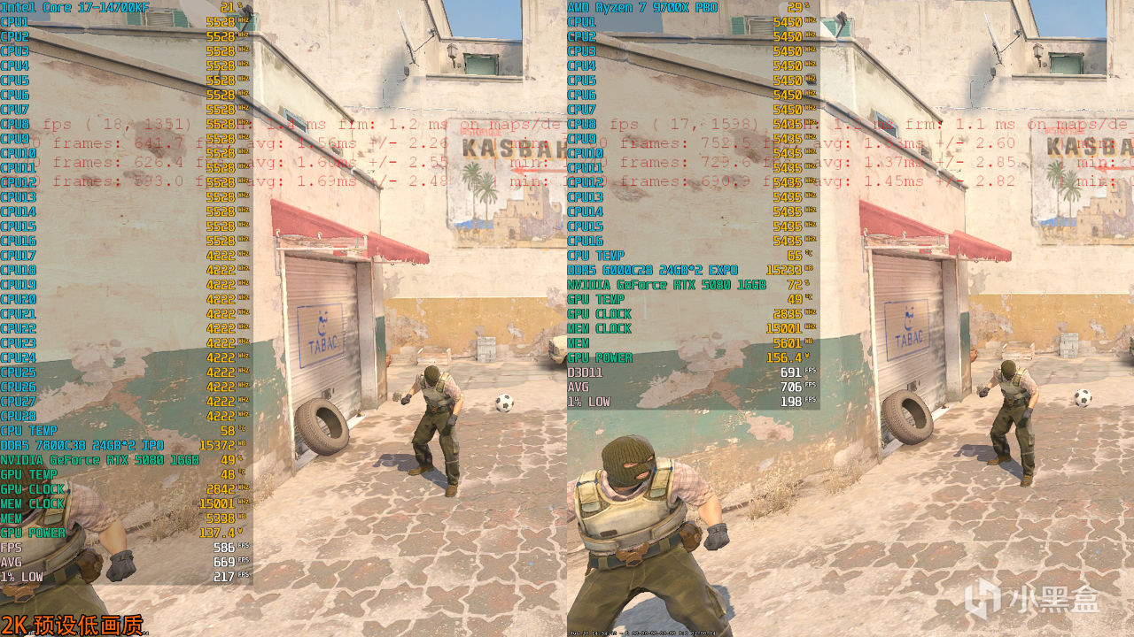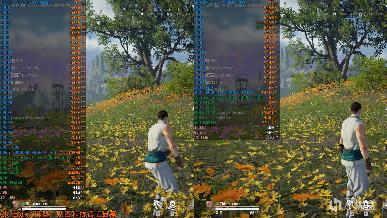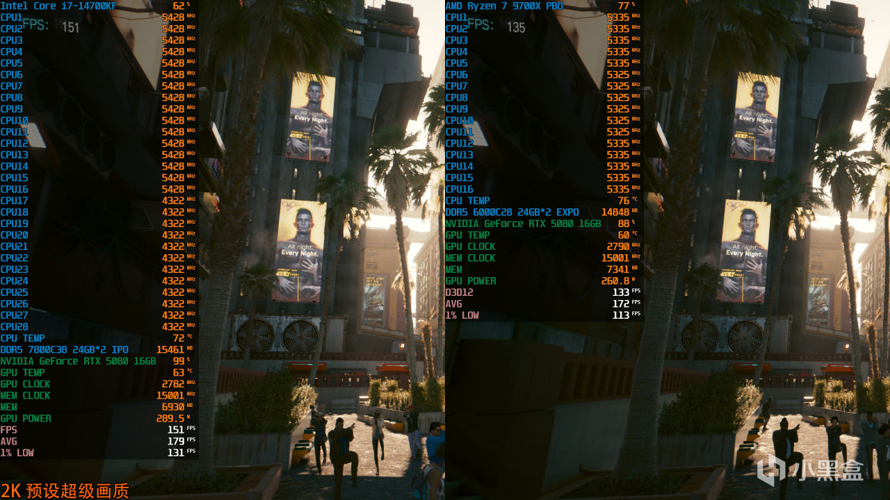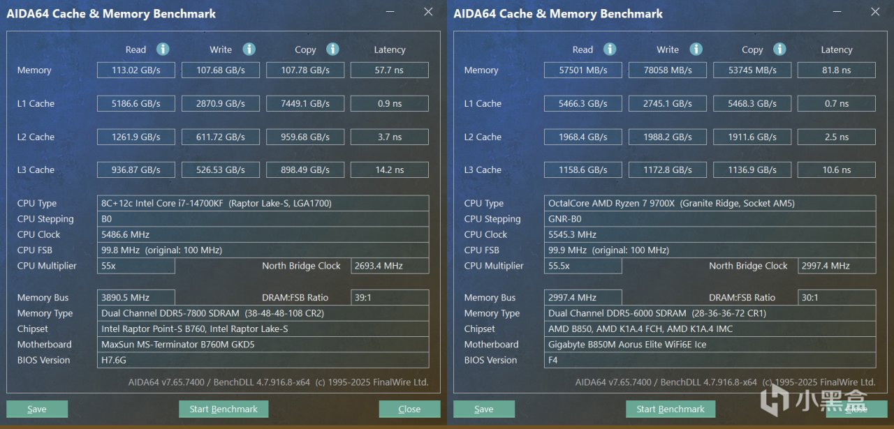 对手方面这次选择了AMD Ryzen 7 9700X,其价位和Core i7-14700KF相近,搭载一套符合AMD特性的品牌DDR5 6000C28 24GB*2内存套装,开启EXPO和AMD PBO技术,两者均搭配360 AIO水冷。