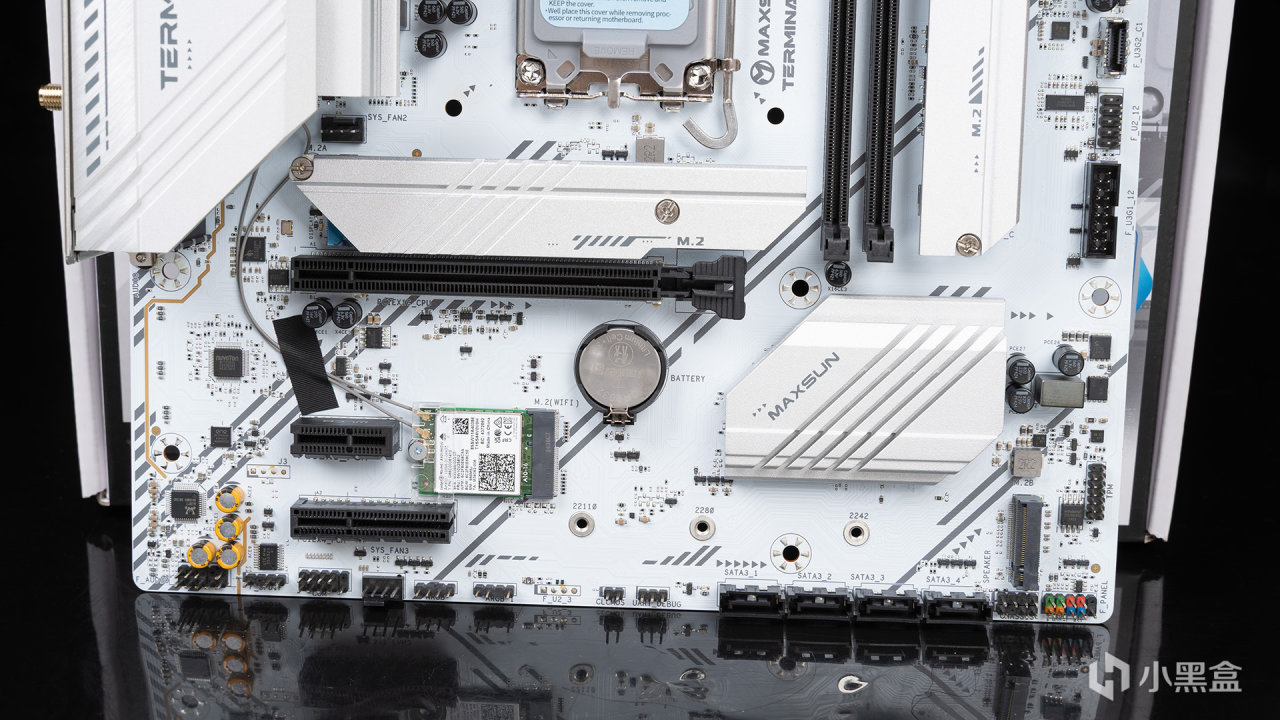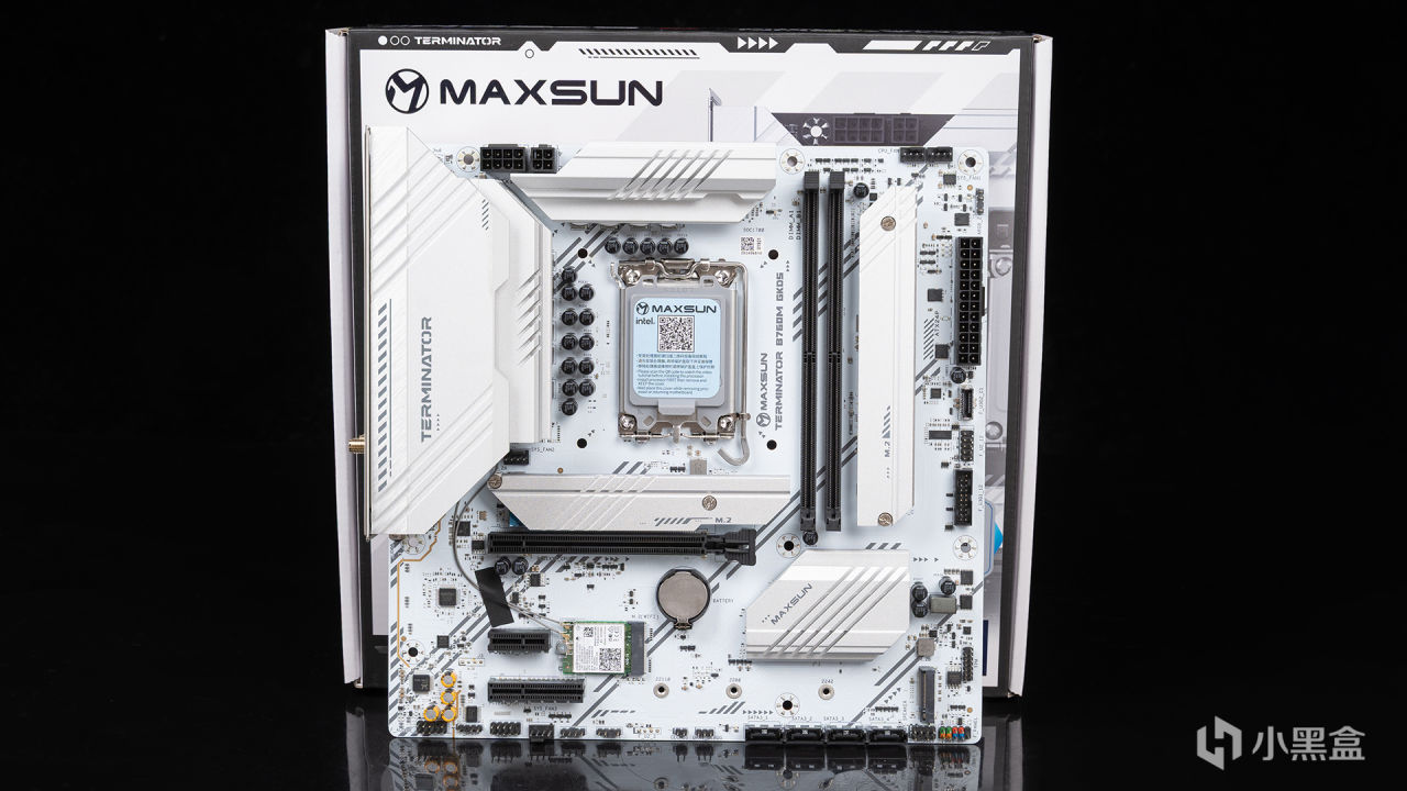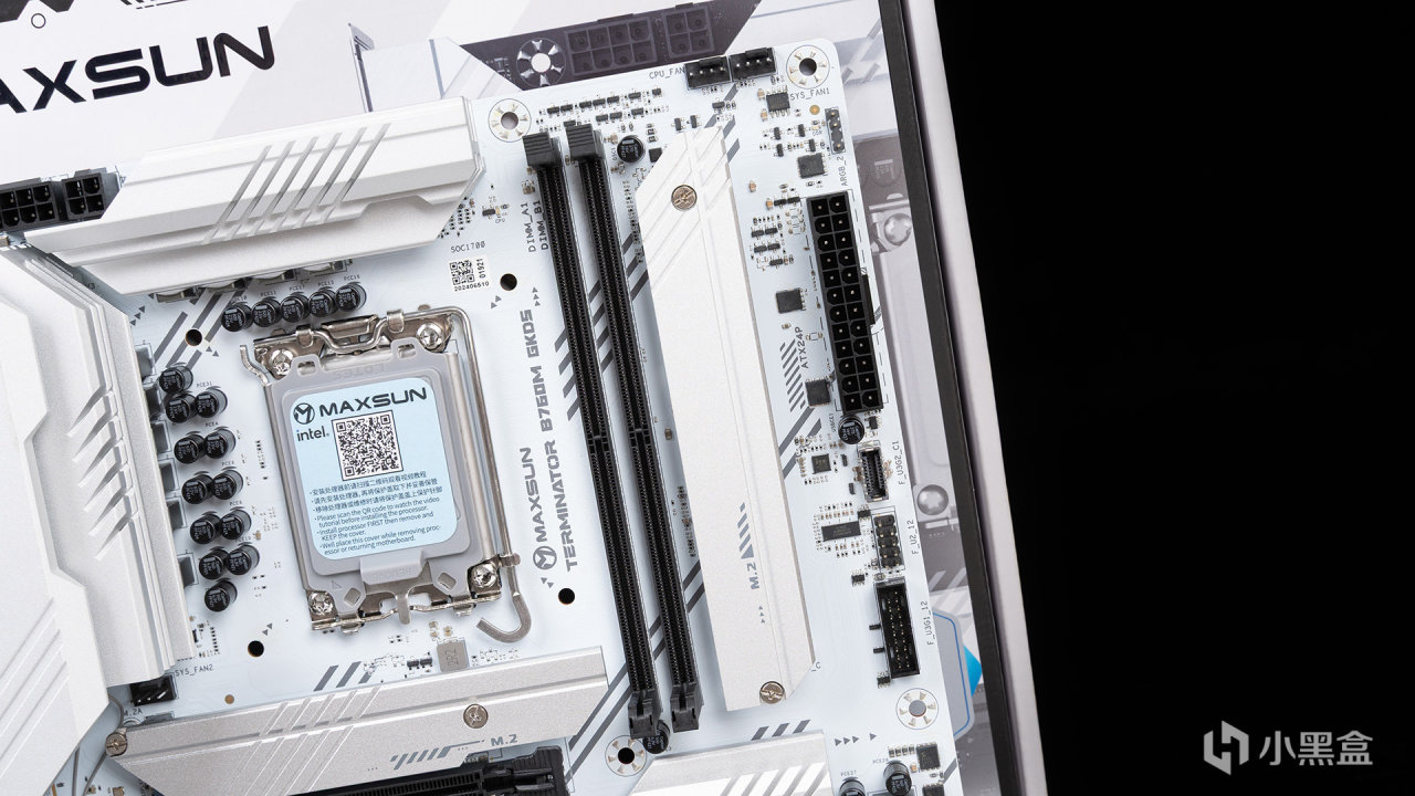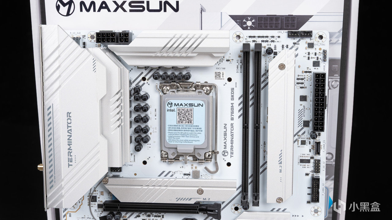 铭瑄终结者B760M GKD5 ICE WiFi版型属于标准245X245MM规格,整体设计为银白主题——覆盖凛霜装甲和PCB区域,装甲上有TERMNATOR、MAXSUN等简洁LOGO,比较迎合白色系装机美学。