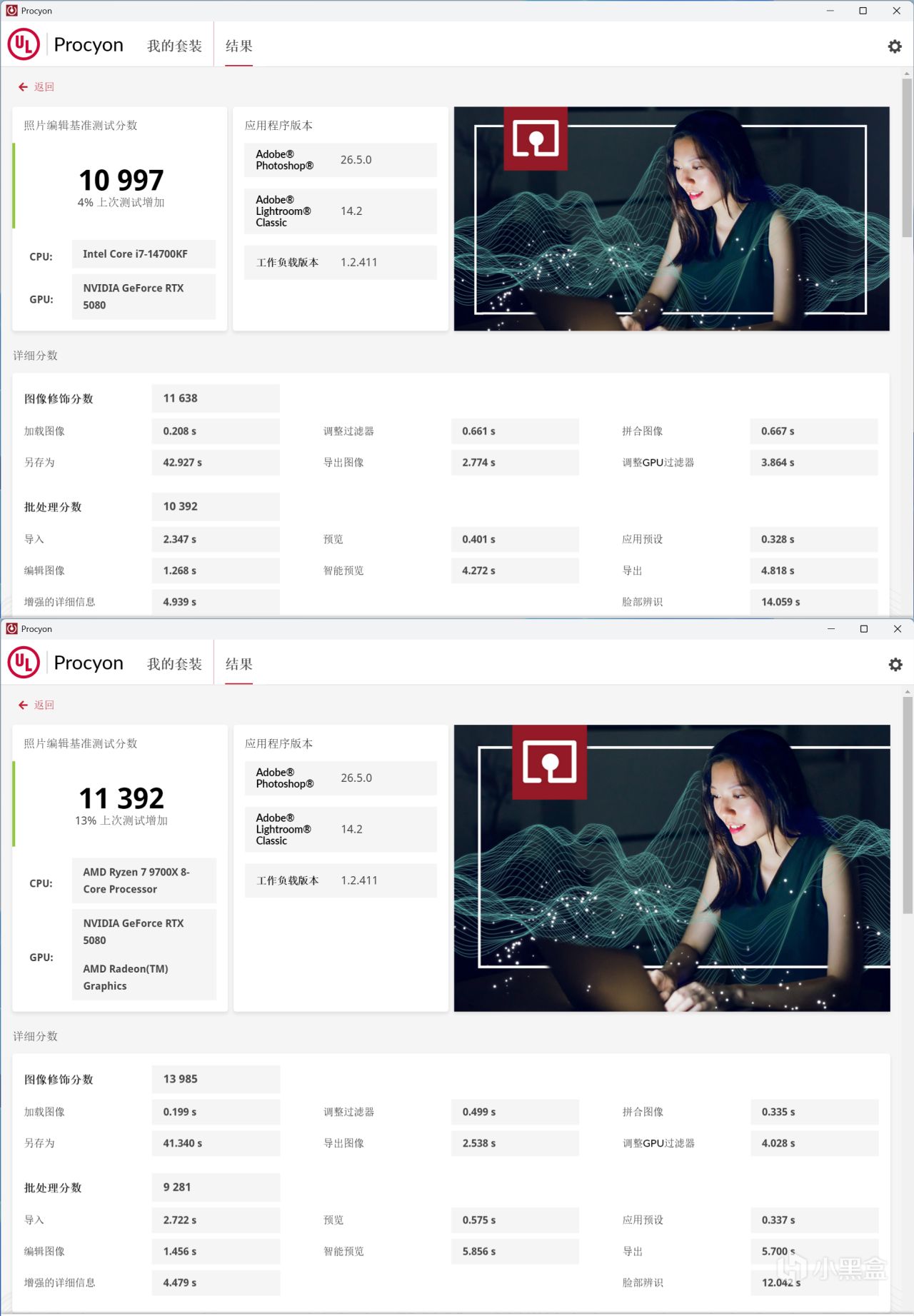 Procyon照片编辑基准项目,涉及Adobe photoshop和Lightroom Classic两个软件,14700KF得分10997,9700X得分则是11392,Zen 5架构终于是扳回一分,领先幅度约为3.5%。总得来看,单核即便是对等,但和14700KF多核优势还是差得远了。