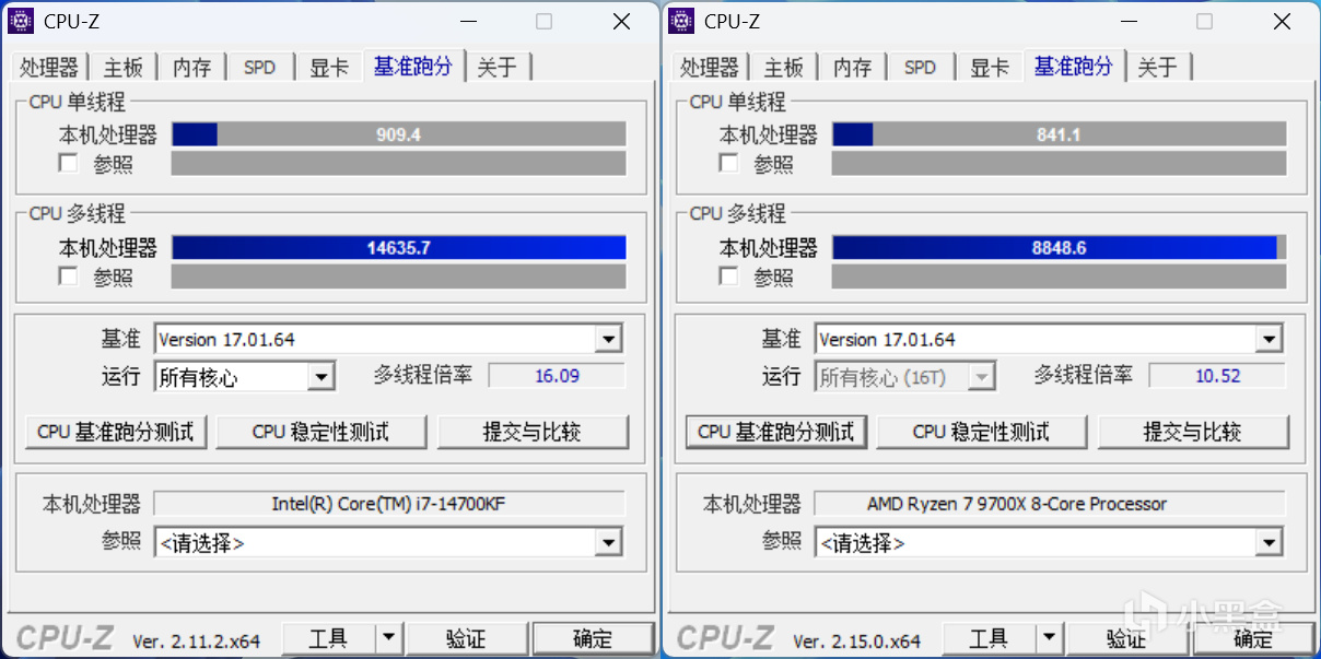 CPU-Z,14700KF单线程分数为909.4,多线程分数为14635.7,9700X单线程分数为841.1,多线程分数为8846.6,14700KF单核会强一些,更优势的是多核方面,毕竟两者核心数量来说14700KF规模和9700X并不是一个级别。