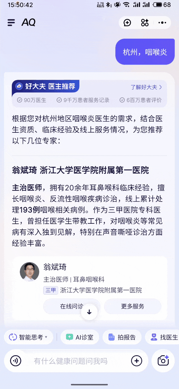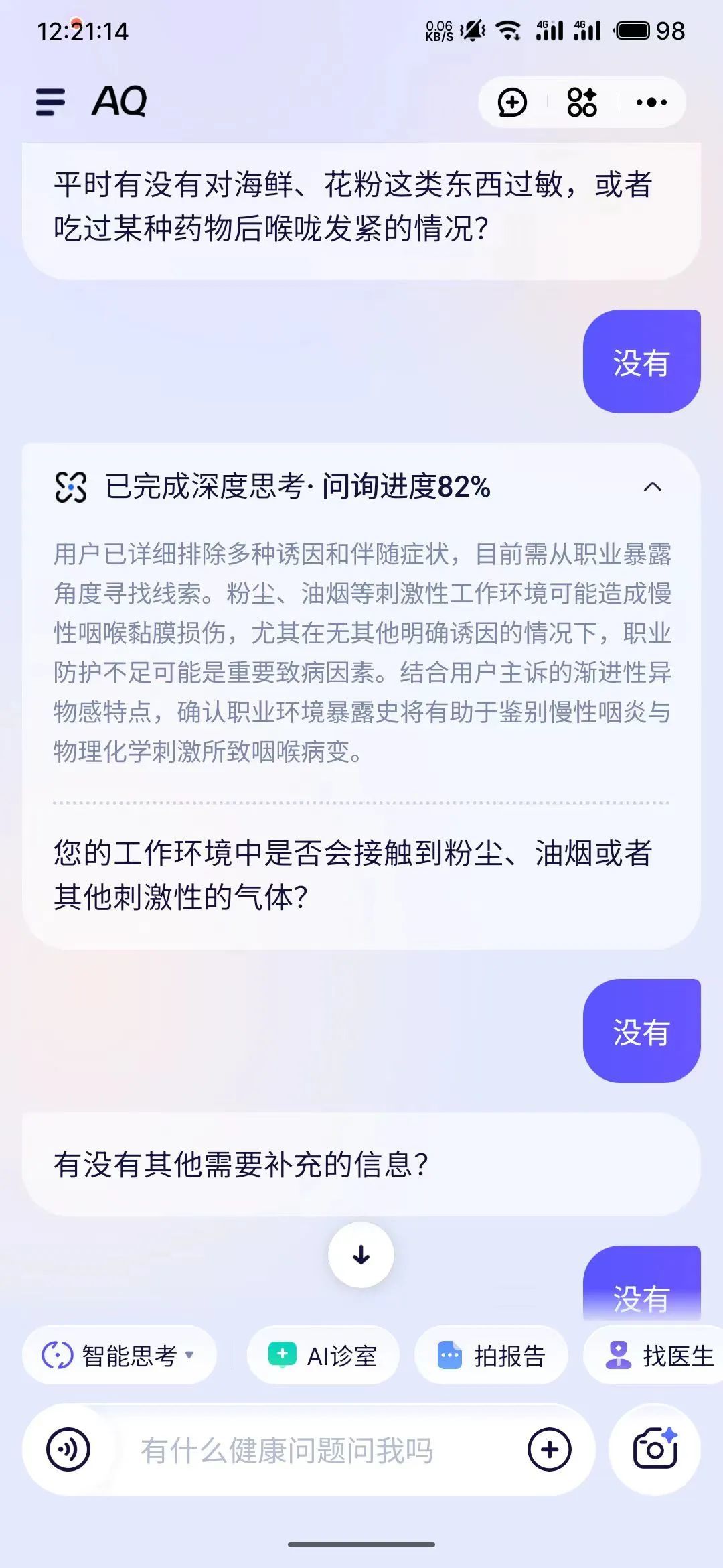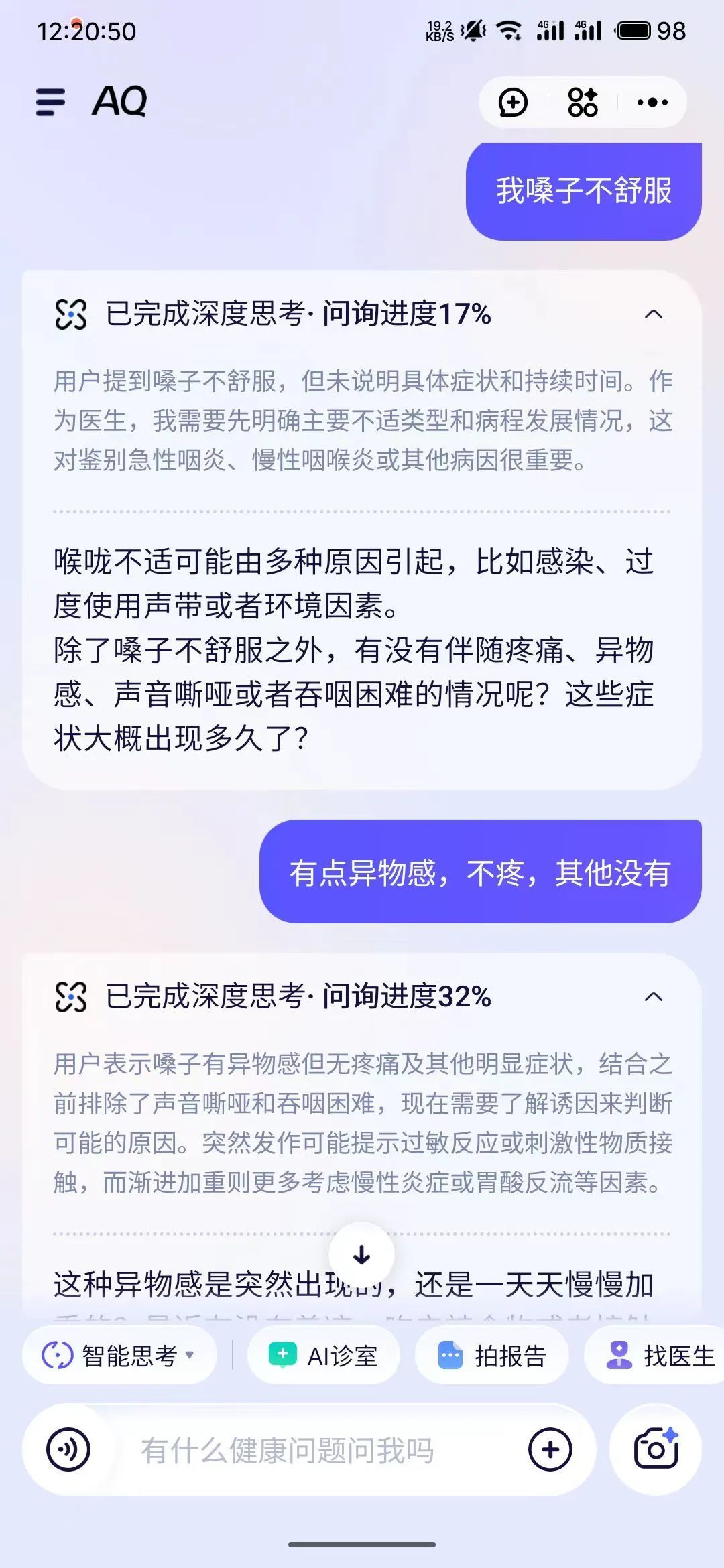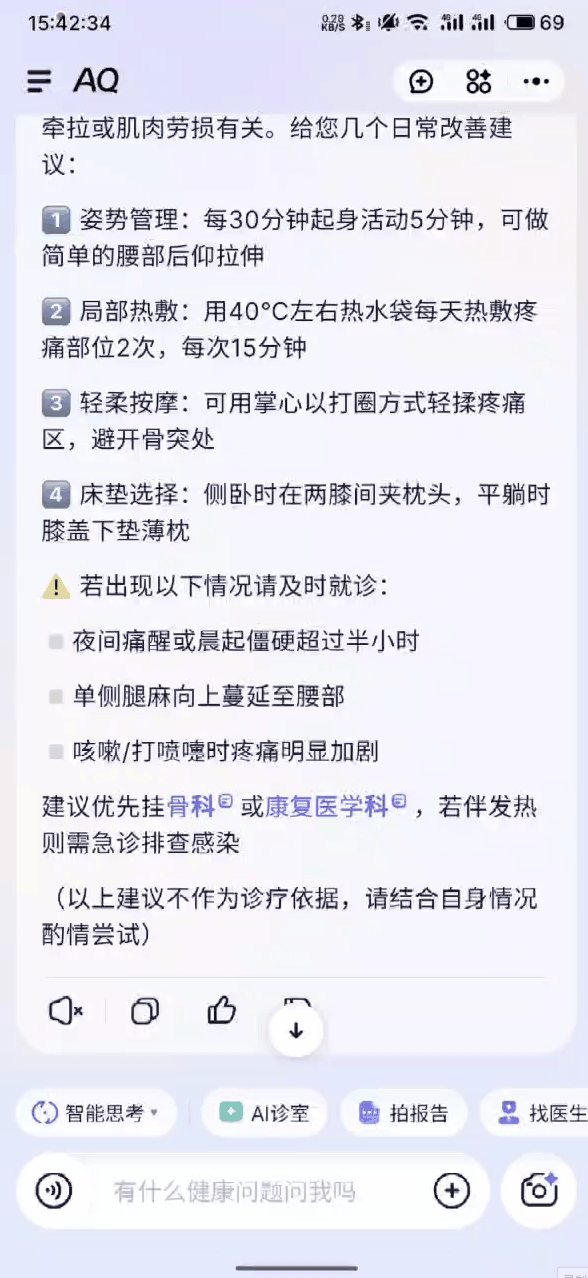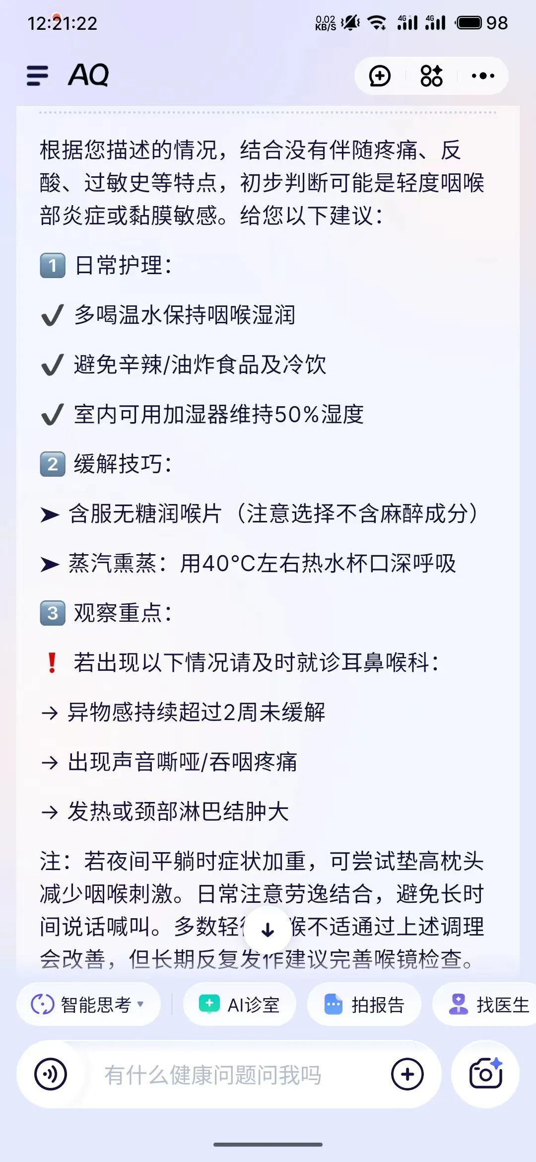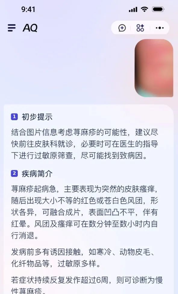 当然需要提醒:AQ这样的应用能给你提供参考和建议,帮你搞清楚状况,但最终诊断和治疗还得听真医生的。AI工具的价值,是让你更好地了解自己的身体,更安心,看病寻医或管健康都更有的放矢。