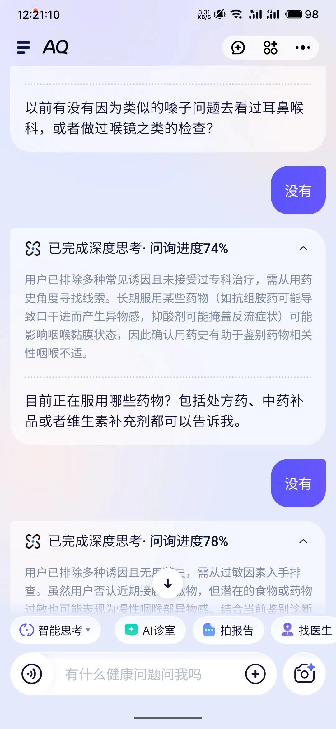 AQ另一个让我惊喜的地方,是在“AI诊室”模式下,它会像个真人医生一样追问你,因为大部分人面对AI,是不知道提问的。现在,你只需要回答问题,它就会用背后的知识库分析你的病情,进而给你建议。