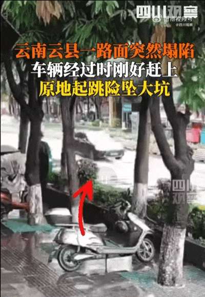 6月23日,云南云县。路面突然塌陷,车辆经过时刚好赶上,原地起跳险坠落大坑。