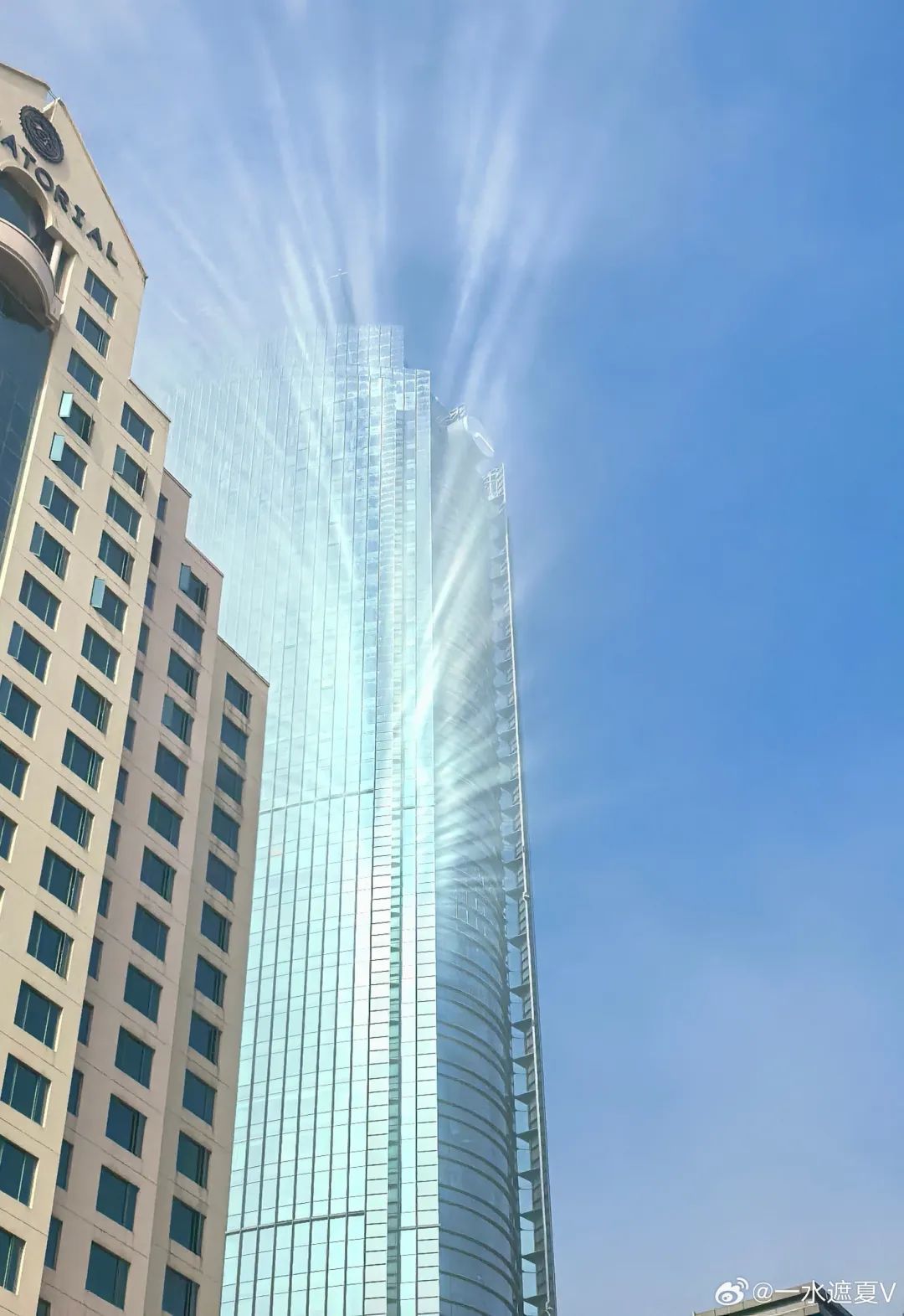 推测为薄雾从海上飘过来,太阳照射到大厦的玻璃上,阳光反射进雾里,于是形成了类似“神光”的现象。