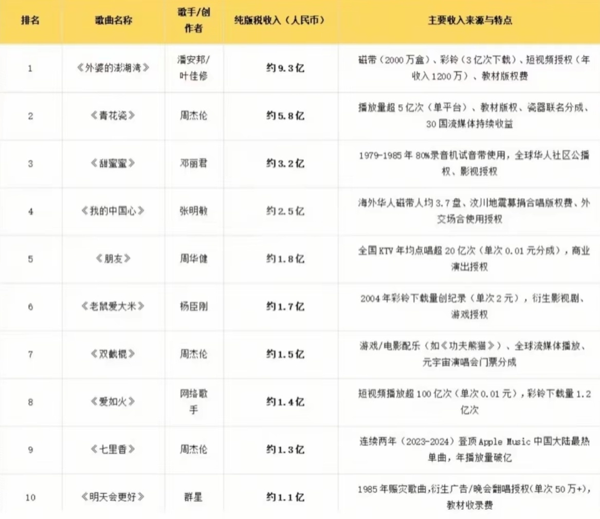 如今那艺娜《爱如火》的纯版税收入已经超过第九名周杰伦的《七里香》位居第八名。短视频播放量超过100亿次(单次0.01元)彩铃下载量1.2亿次