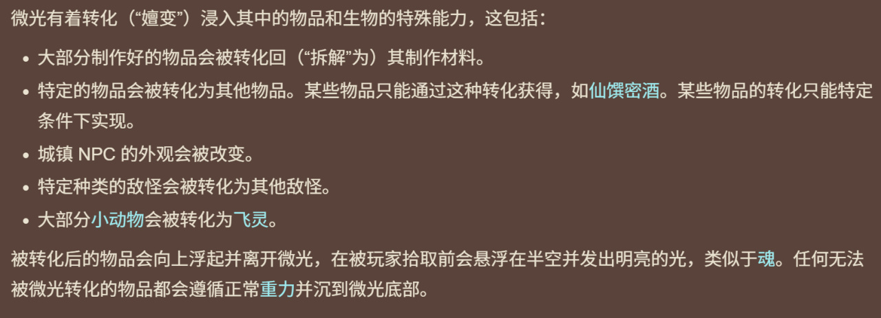 设定上微光湖是某种生物的胃液,因此它能够做到“分解”这一功能。不仅如此,它还有着特殊的作用“嬗变”,我们可以理解为转换。
