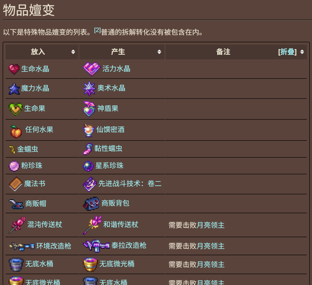 嬗变,又可以理解为转换,它可以将一个物品转换为另一个物品。譬如掉落于僵尸的僵尸臂可以被嬗变为蠕虫掉落的整蛊坐垫,前者是武器,而后者则是罐中臭屁的合成材料。又比如魔矿也可以转换为猩红矿,它们制作出来的武器有着不同的优点。这样的转换还有很多。