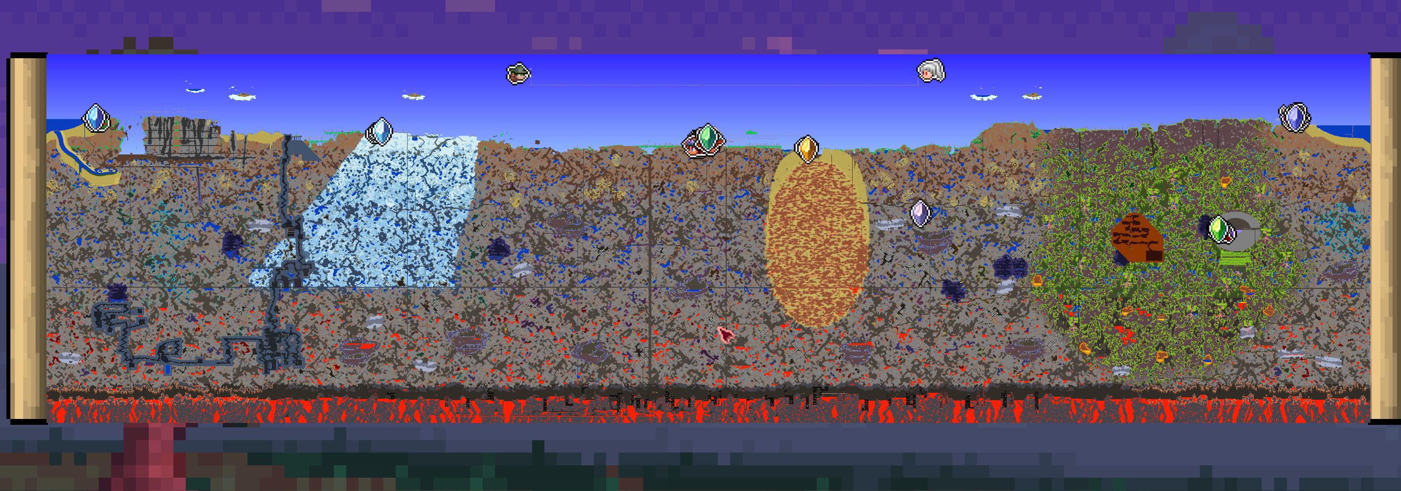 在游戏中,微光湖是一个很有意思的群系。它一般位于海洋地下与丛林地下的交界处,其两侧会分布着宝石树。