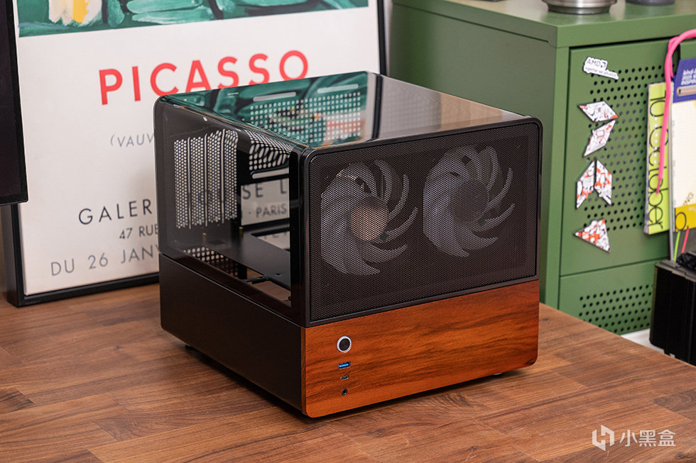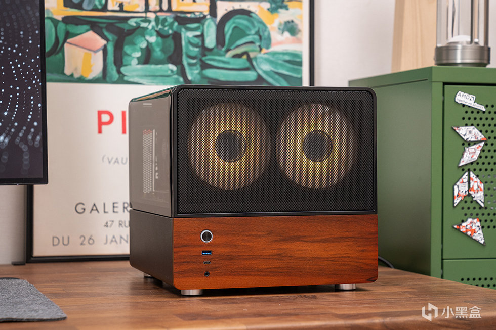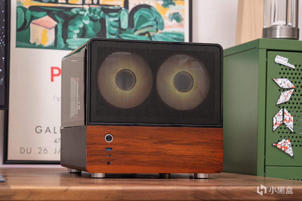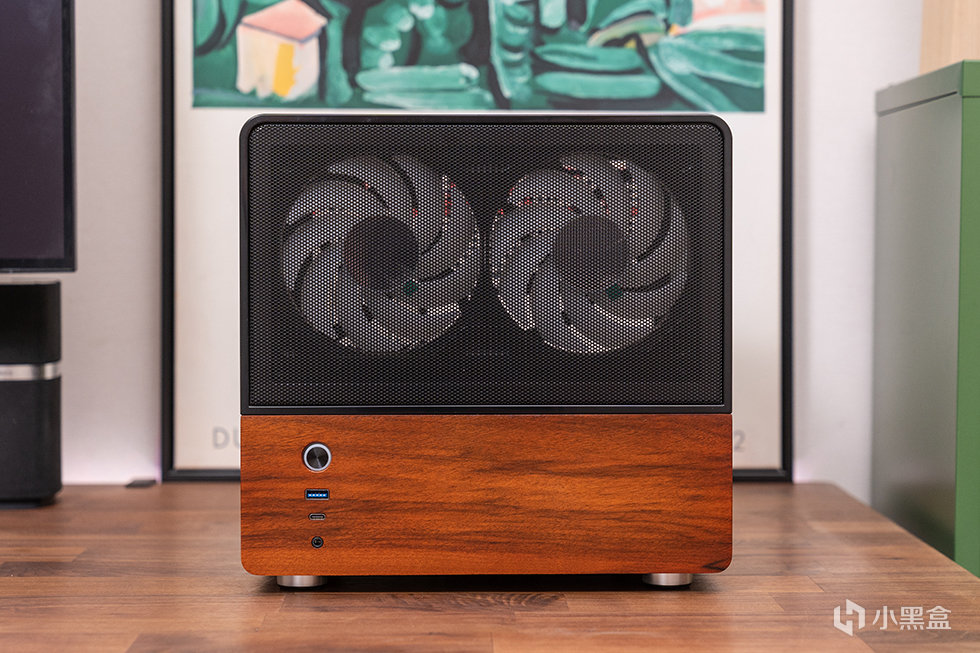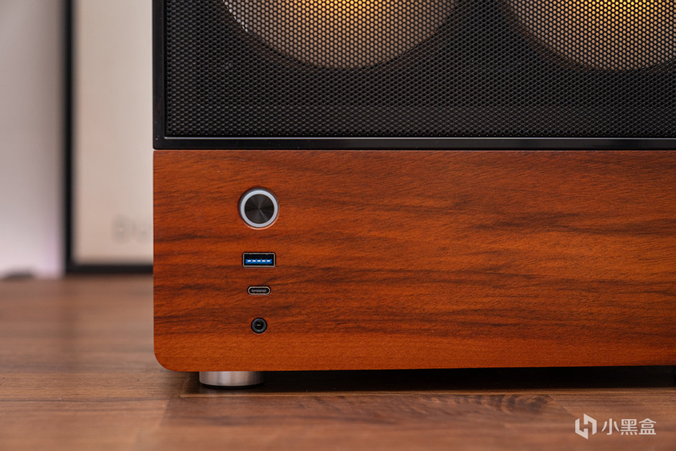 机箱正面为mesh网面结合胡桃木饰面板撞色设计,采用8mm厚度北美黑胡桃木实木材质,自然纹理,融合家居。前面板IO布置在左下方,包含了开关、USB 3.0、USB 3.2 Gen Type-C(10Gbps)和一个音频接口。