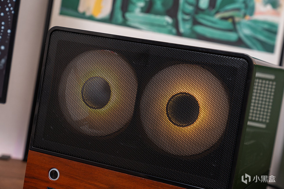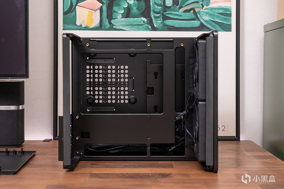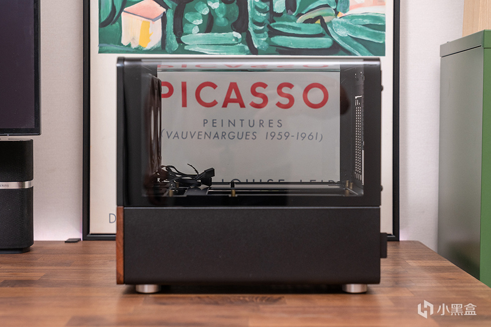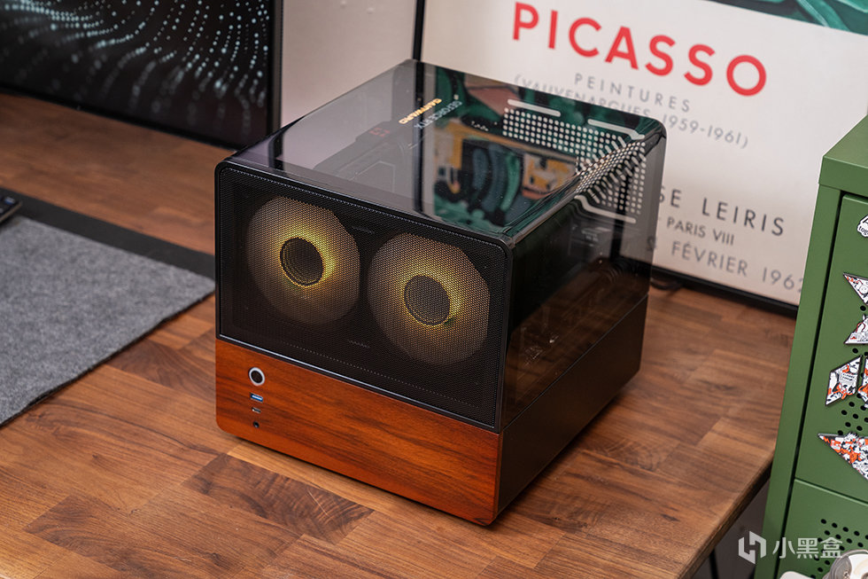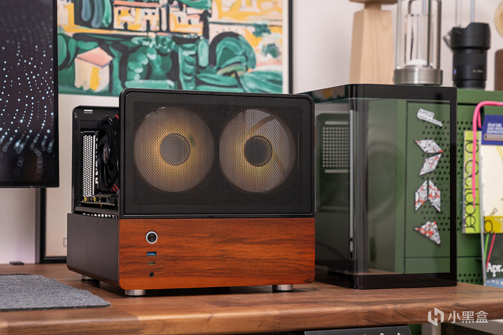 机箱正面为mesh网面结合胡桃木饰面板撞色设计,采用8mm厚度北美黑胡桃木实木材质,自然纹理,融合家居。前面板IO布置在左下方,包含了开关、USB 3.0、USB 3.2 Gen Type-C(10Gbps)和一个音频接口。