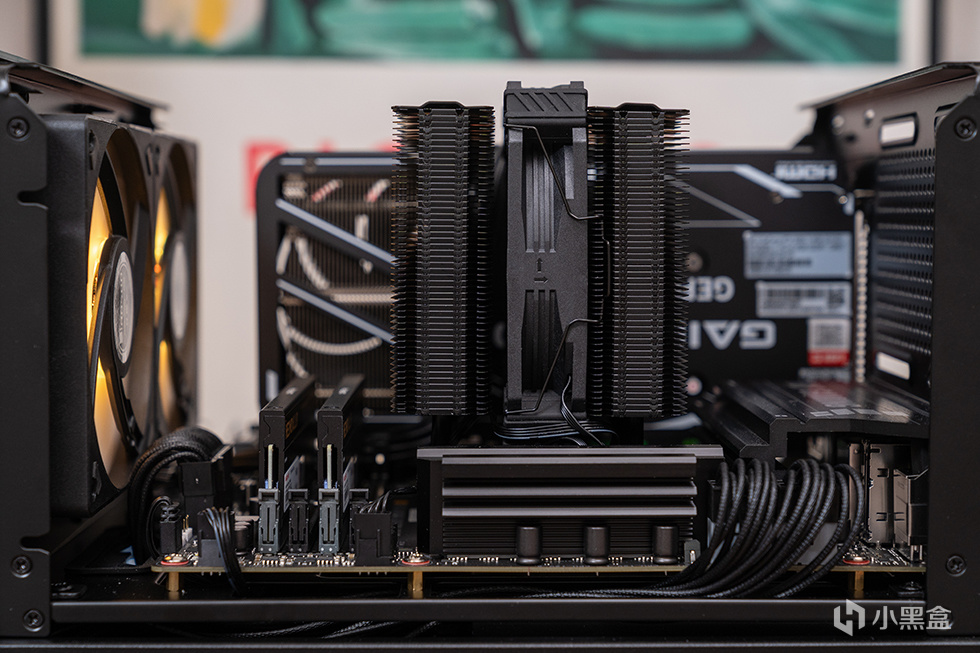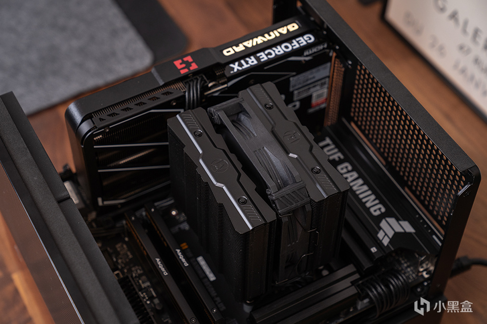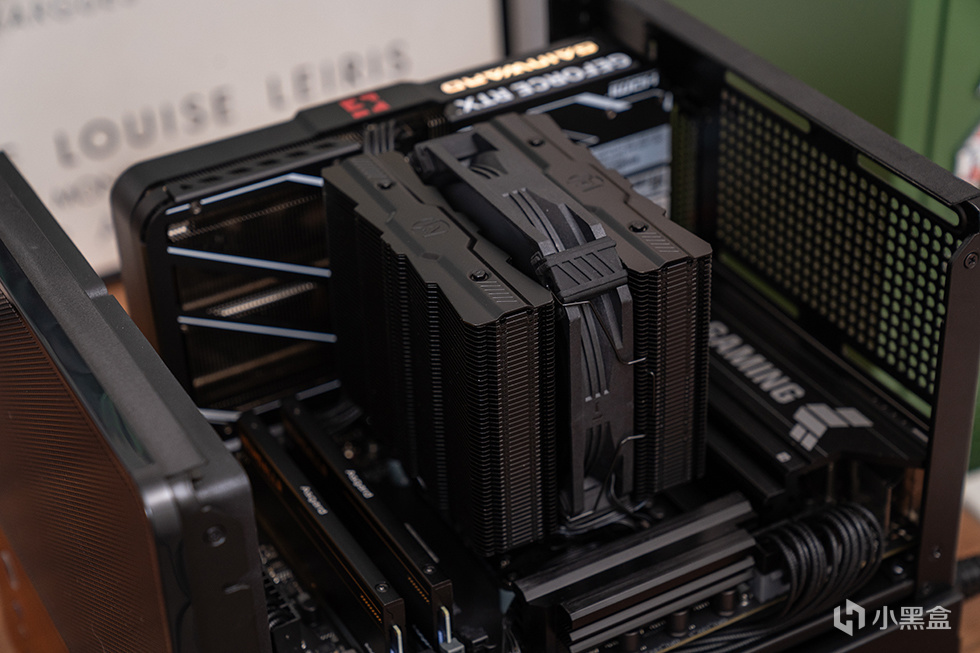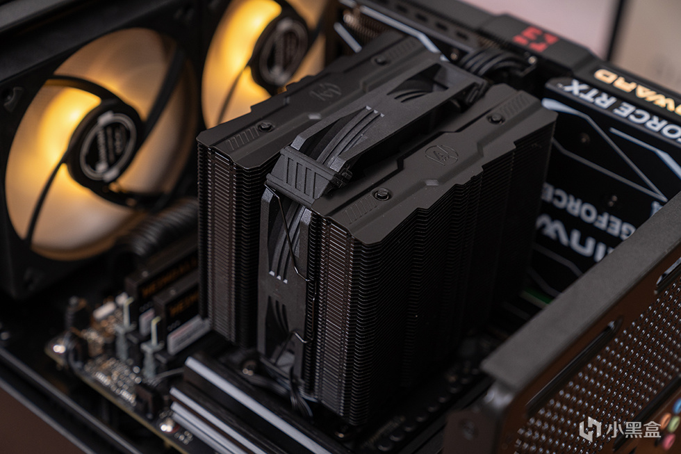 散热器本体的顶部采用了对称鳍片外观,鳍片数量多达52片,鳍片之间采用扣Fin+折Fin的工艺固定,可使热管与鳍片衔接紧密,热量传导顺畅,双塔单扇结构不挡内存马甲,杜绝内存兼容性问题。