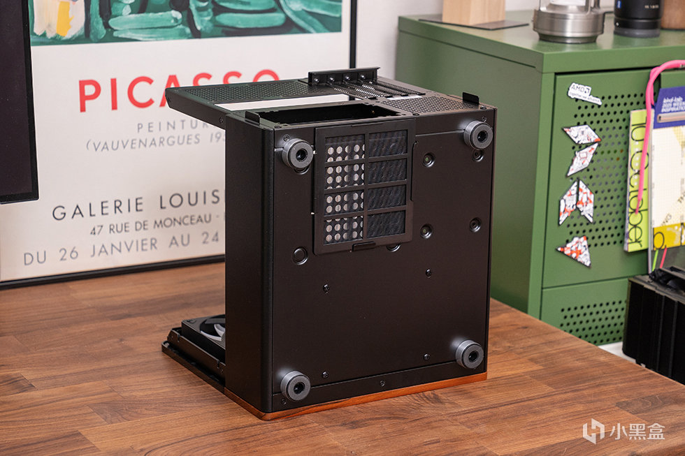 机箱底部对应的电源仓位置做了开孔处理,并配备可拆卸防尘网。