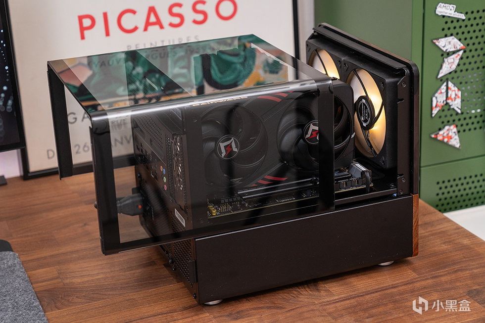 乔思伯V12 一款桌面级MATX机箱,融合玻璃侧透和实木饰板等设计元素。机箱整体大小为280mm(W)*301mm(D)*275.5mm(H),上方为双折弯一体玻璃,拥有270°全景天窗,硬件展示一览无遗,同时采用北美胡桃木实木饰板,让桌面主机更好入家居化风格。上下分仓设计,硬件各得其所,前面板铁网进风口标配2颗12CM发光风扇,兼顾散热和质感。