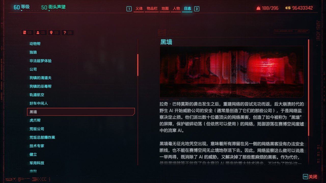 黑牆是由網監開發的一款防火牆。位於賽博空間,它的任務是阻止流竄AI闖入並肆虐剩餘的賽博空間。