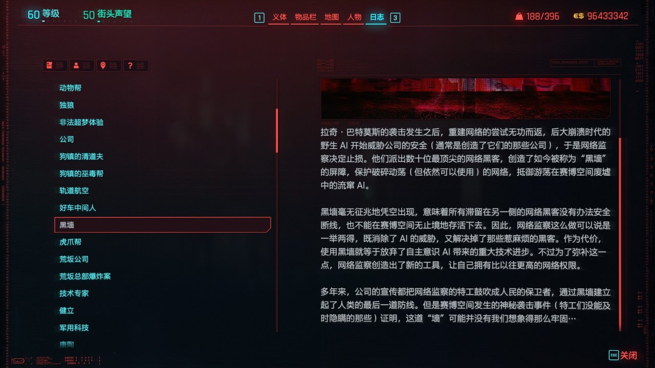 拉奇·巴特莫斯的襲擊發生後,重建網絡的嘗試無功而返,後大崩潰時代的野生AI開始威脅公司的安全(通常是創造了它們的那些公司),於是網絡監察決定止損。他們派出數十位最頂尖的網絡黑客,創造瞭如今被稱爲“黑牆”的屏障,保護破碎動盪(但依然可以使用)的網絡,抵禦遊蕩在賽博空間廢墟中的流竄AI。