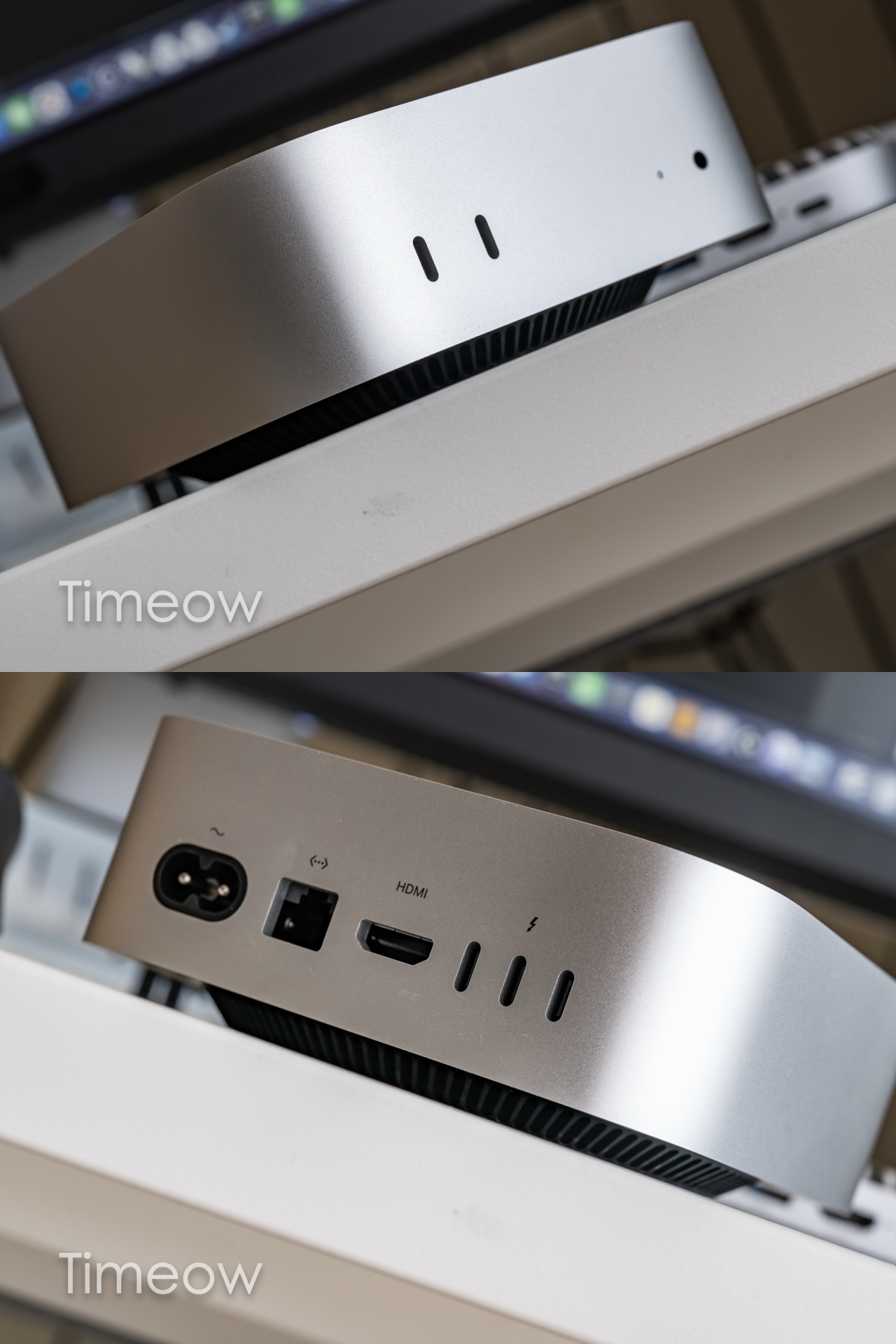 外觀方面,Mac mini一如既往的用了鋁合金材質,質感還可以,而且散熱孔設計在底部,整機看起來簡潔低調又實用,放到顯示器下方一點都不佔地方。