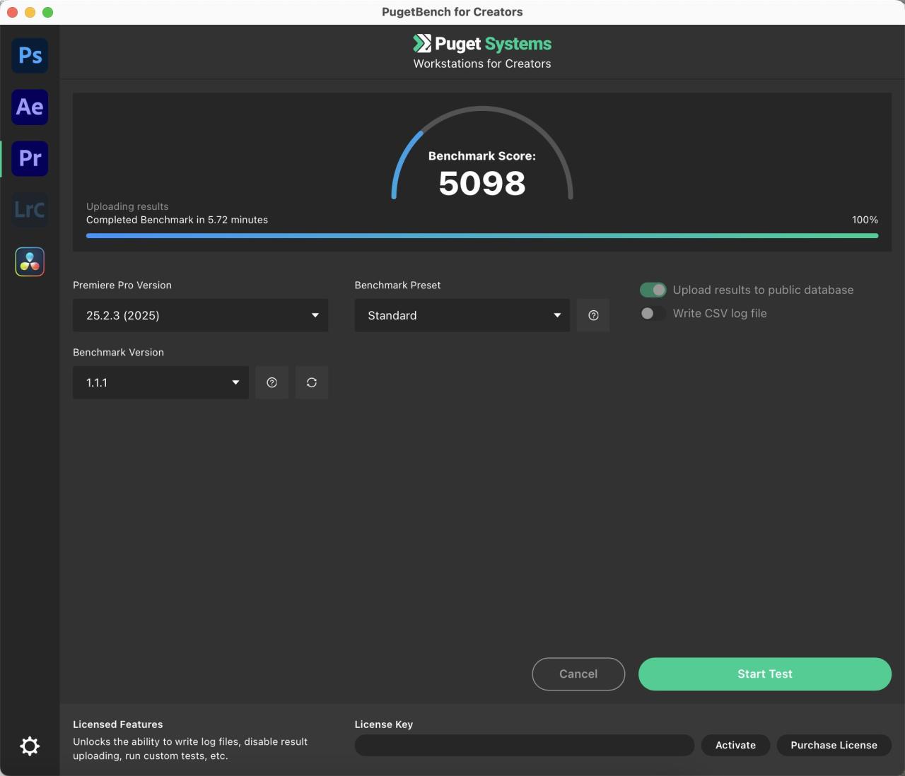 PugetBench是由Puget Systems開發的基準測試工具套件,它可以直接調用PS、Pr等專業軟件的功能模塊,通過批量處理、視頻渲染等操作模擬真實工作負載,可以較爲準確的評估專業軟件在真實工作場景下的硬件性能表現。
