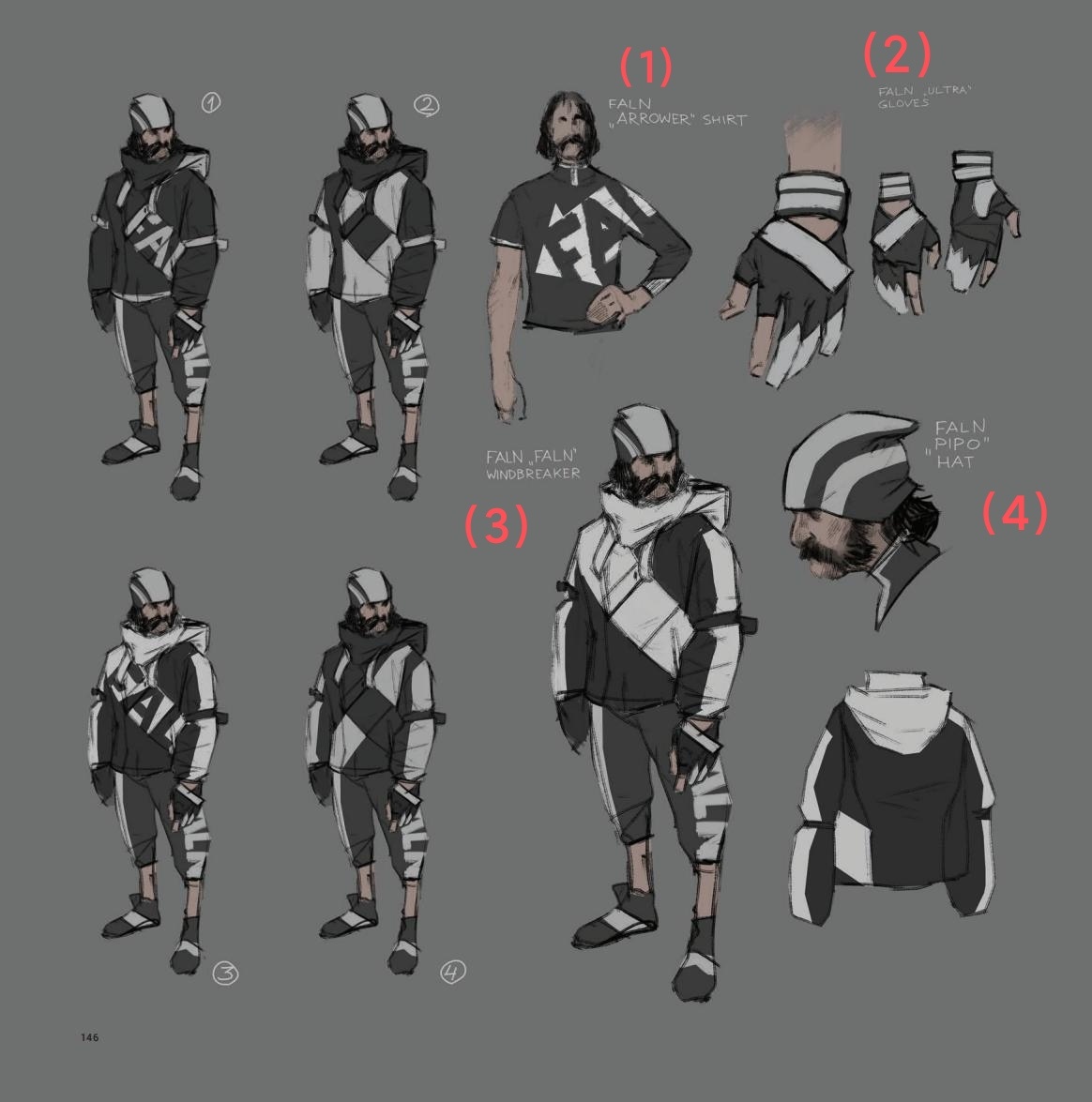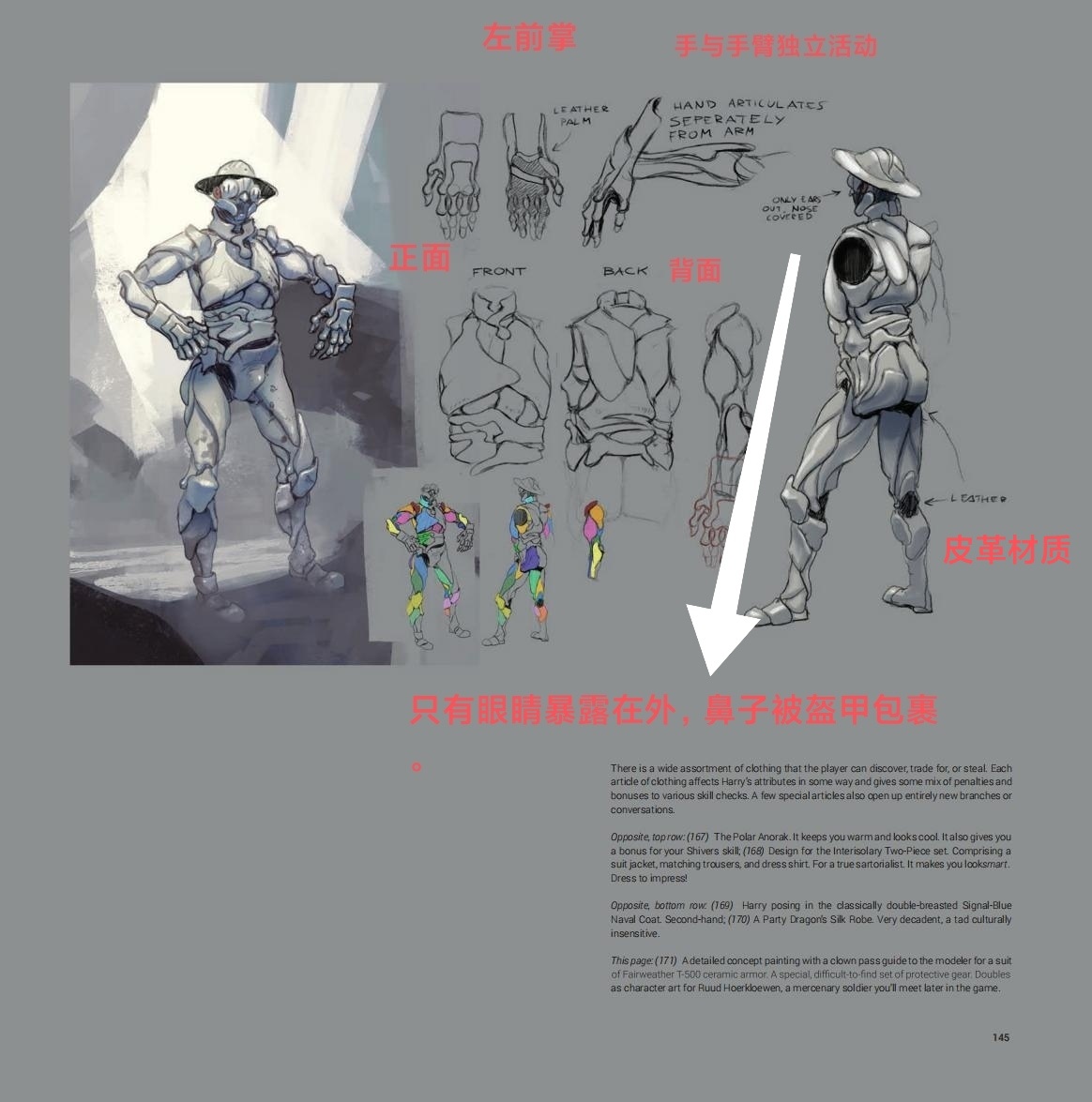 一套詳細的構想圖,供建模參考,它的設計思路受到小丑風格的啓發。它就是特殊的,難以被找到的“fairweatherT-500陶瓷裝甲”。它還被遊戲後期能遇到的僱傭兵士兵所穿着。