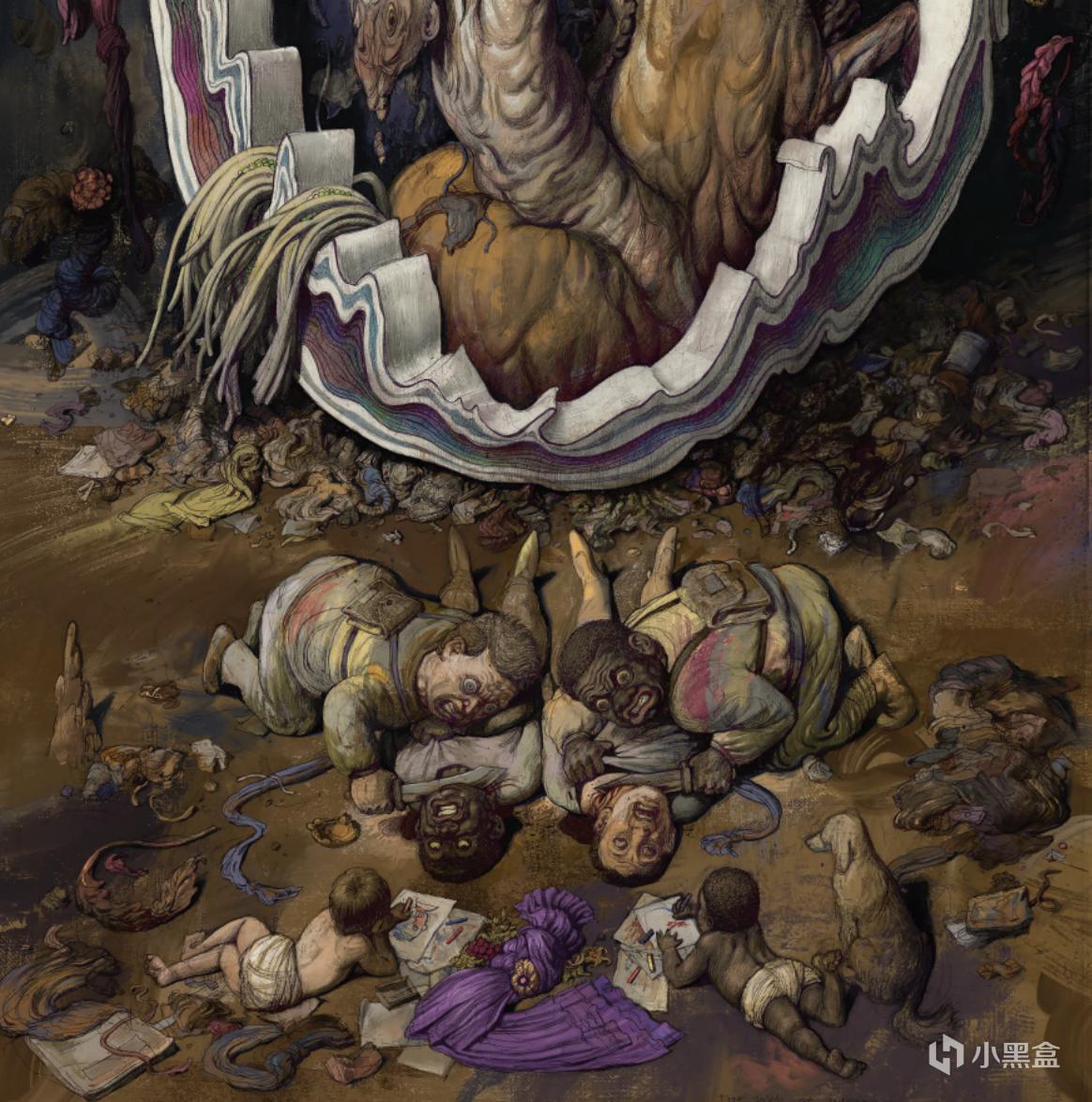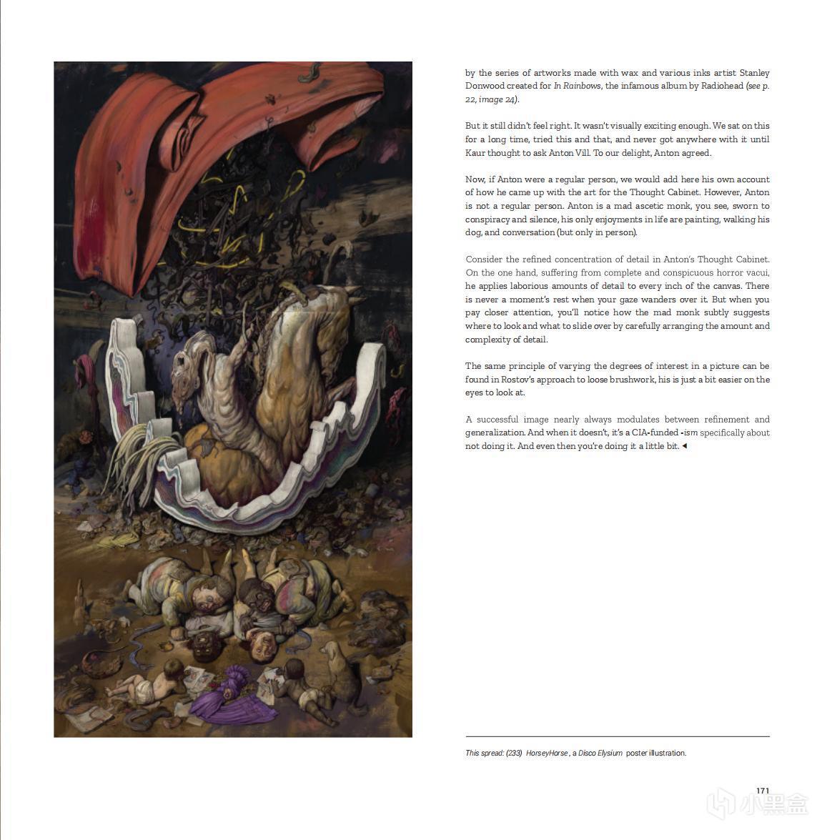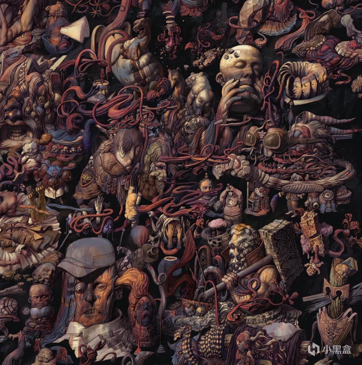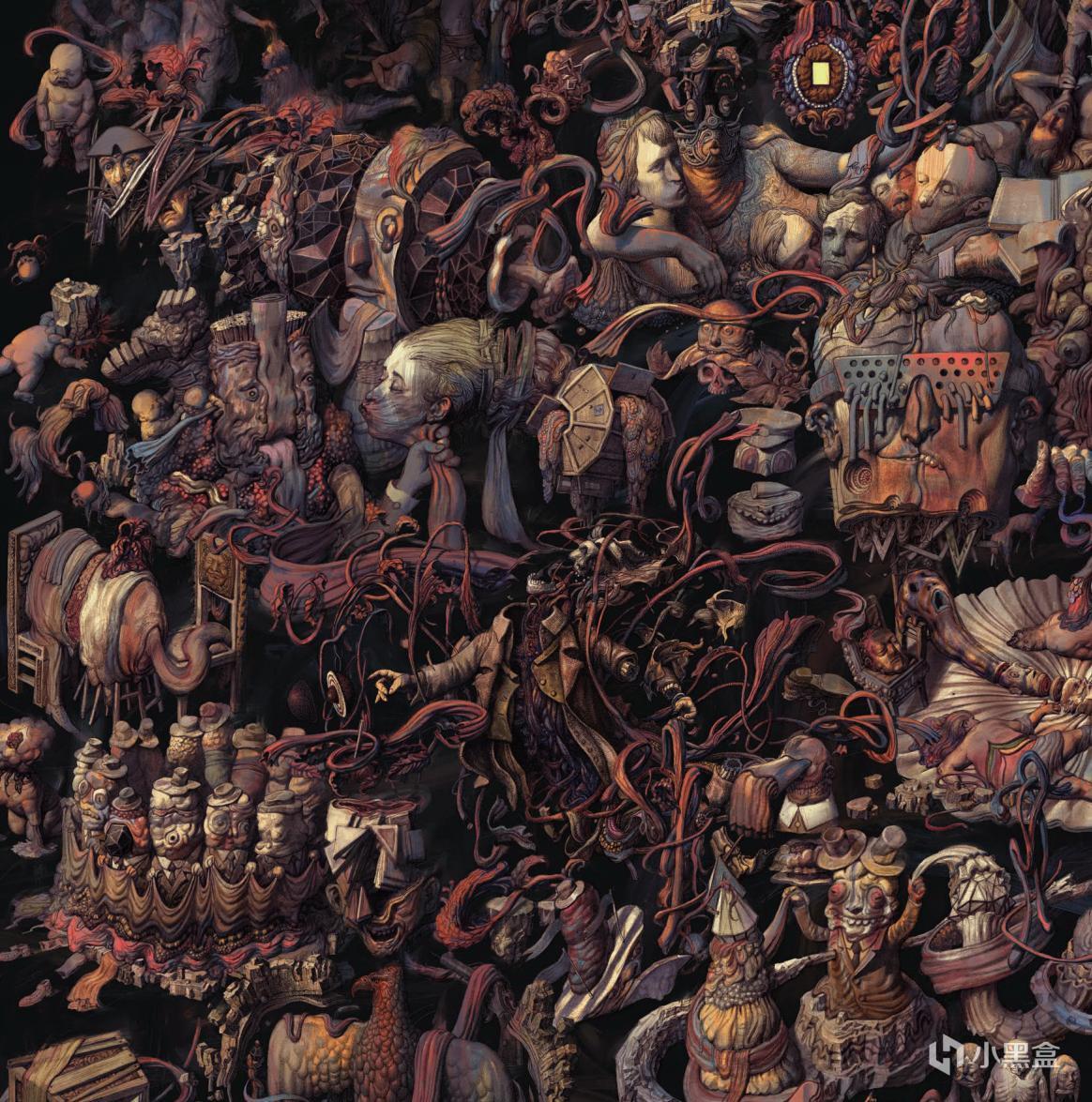 不妨想想安東的“思維閣”中那些精心雕琢的細節。一方面,他深受顯而易見的“空虛恐懼”所困擾,所以他爲畫布上的每一寸空間都注入了大量的細節。當你的目光在畫面上游弋時,幾乎找不到片刻的喘息。但當你更加專注地觀察時,你會發現這位瘋狂的僧侶是如何通過精心安排細節的數量和複雜性,巧妙地引導觀衆去注意某些特定的部分,以及忽略另一些部分。