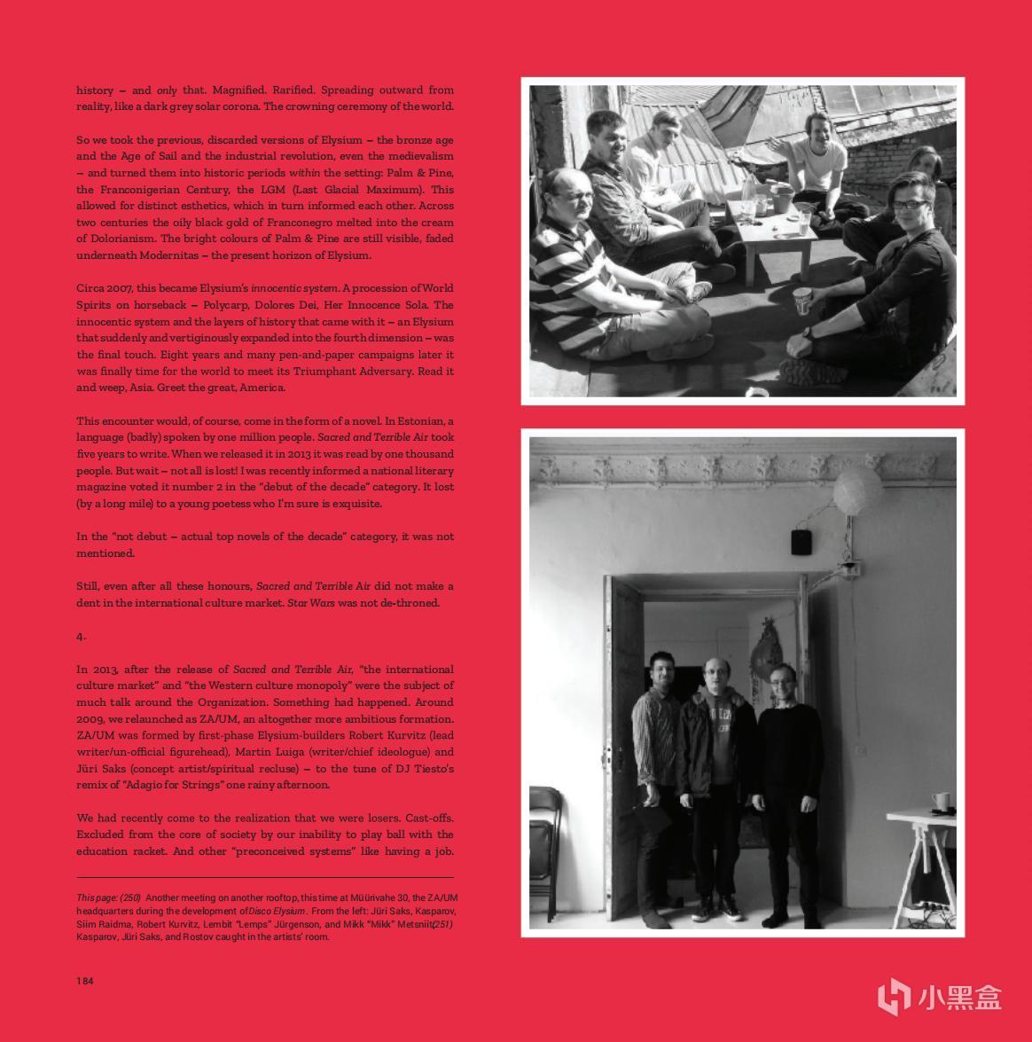 在2013年,《神聖而可怕的空氣》發佈後,“國際文化市場”和‘西方文化壟斷’成爲了組織內部熱議的話題,發生了一些事情。大約在2009年,我們重新啓動了ZA/UM,這是一個更具雄心的團隊。ZA/UM 的第一階段,極樂世界的初步構建由愛麗舍建設者羅伯特·庫爾維茨【首席編劇排正式領袖 】馬丁·格加【作家/首席理論家】和尤里·薩克斯【概念藝術家/精神隱士】組成——在一個雨天的某個下午,他們合奏了迪傑.蒂斯特諾 的《絃樂柔板》混音版。