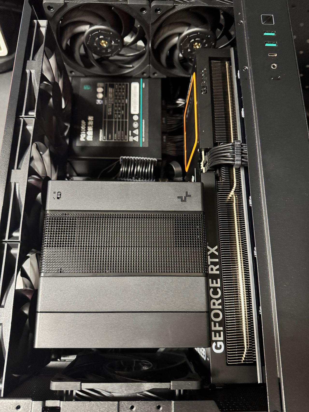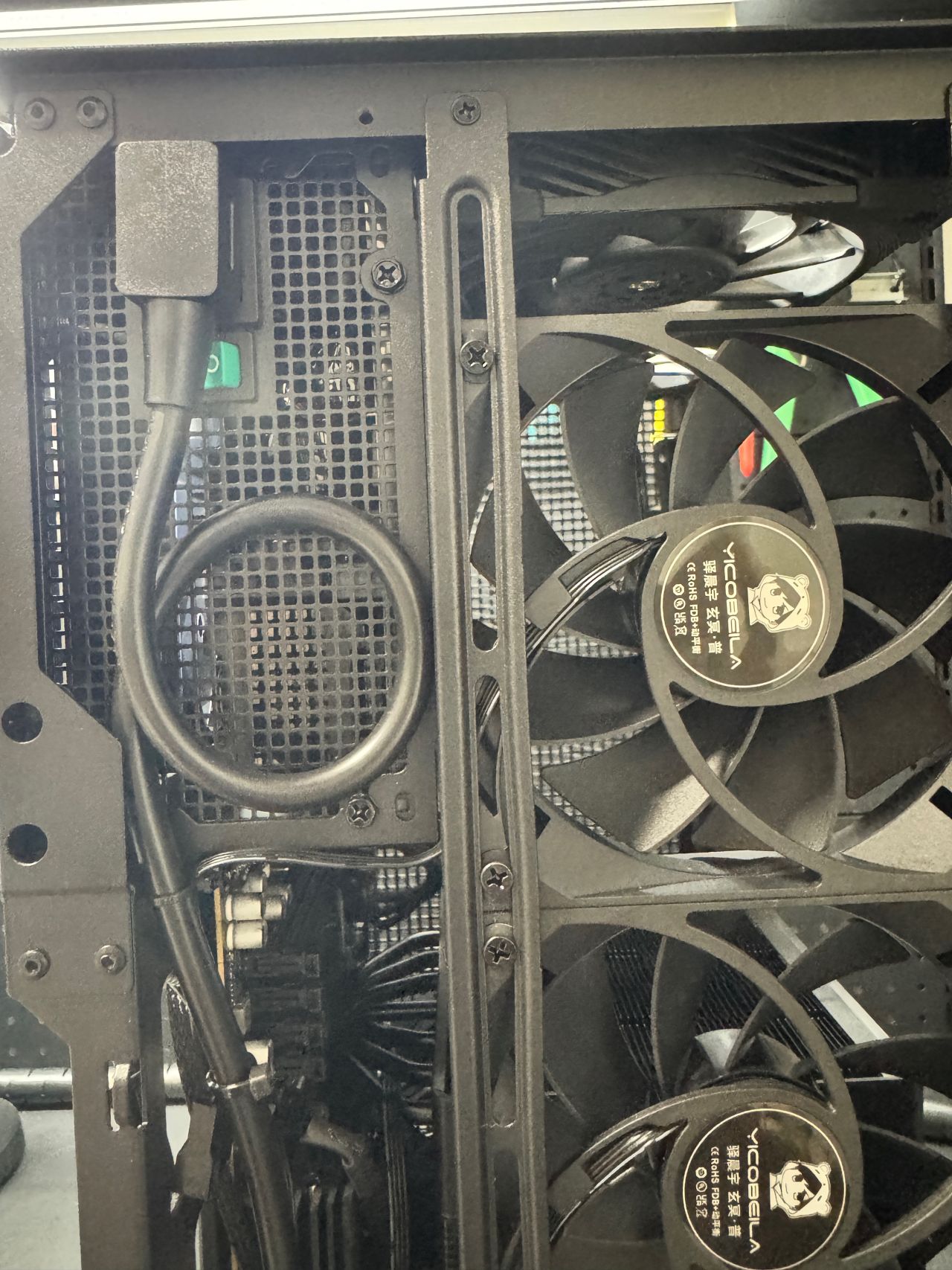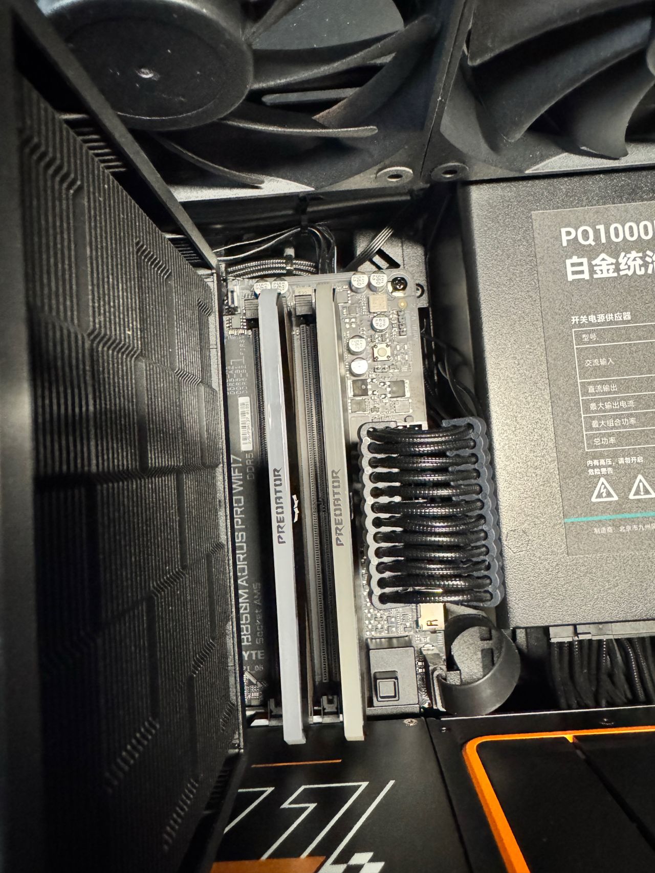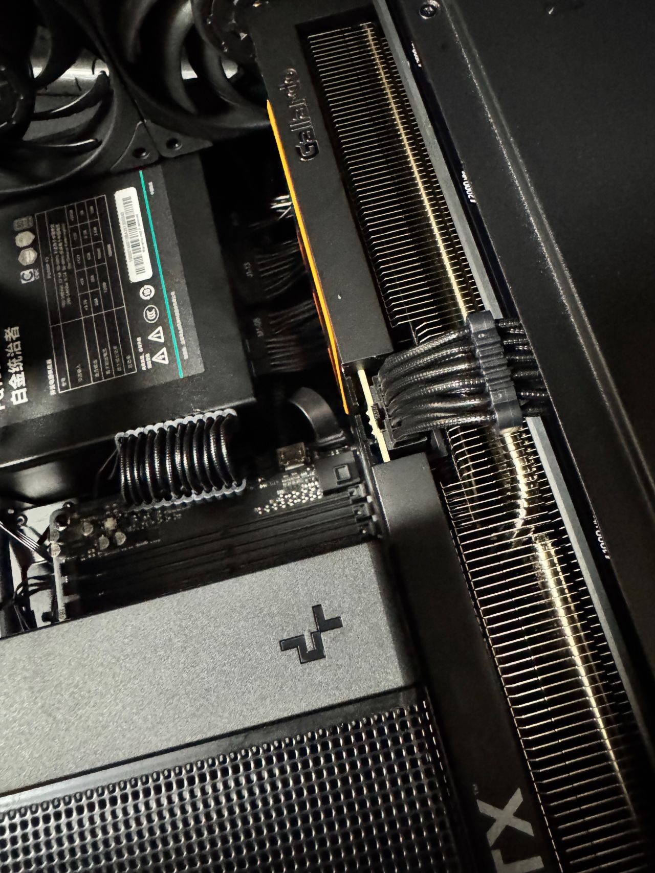 盒友使用的是5070TI显卡,显卡供电线,可以走显卡风扇面,不会与风扇打架,不建议5080以上显卡,显卡太厚,供电线无法走显卡风扇面。
