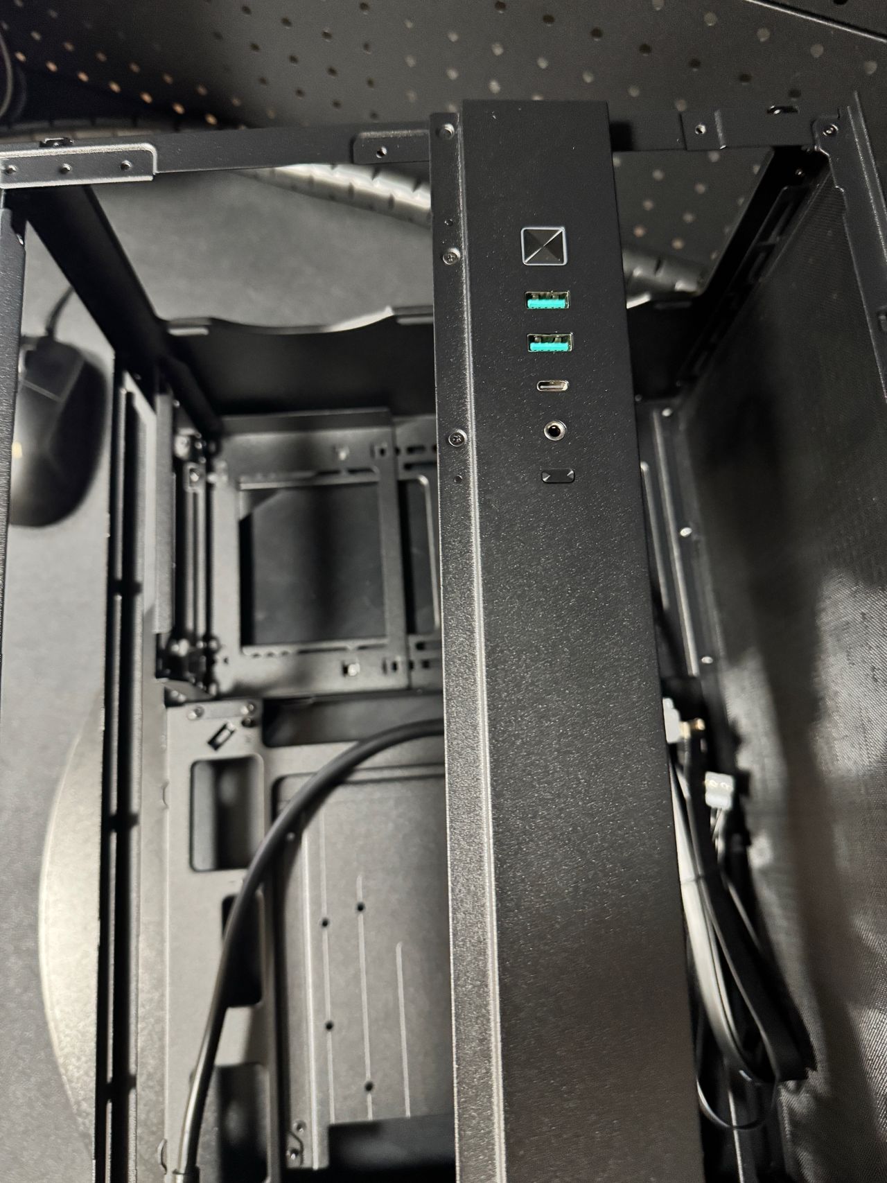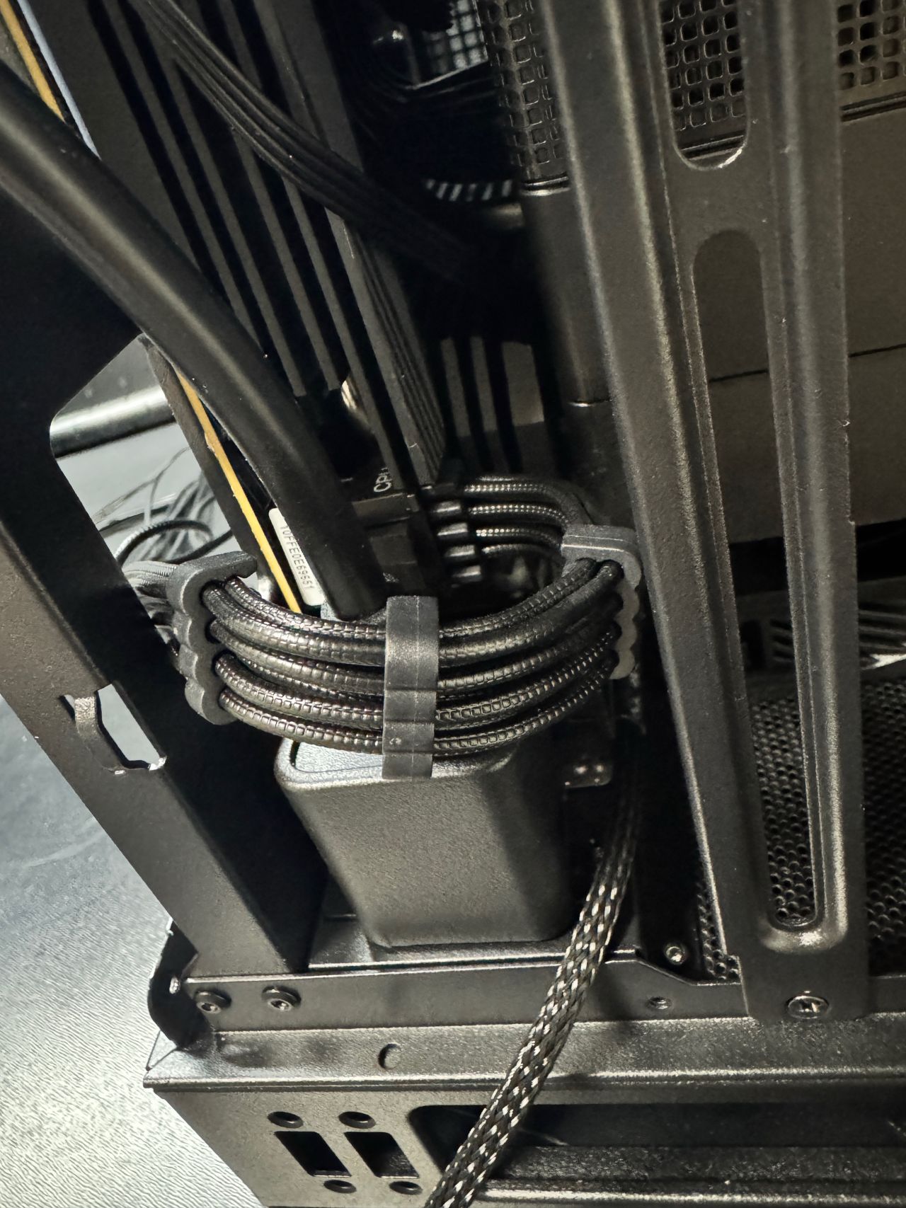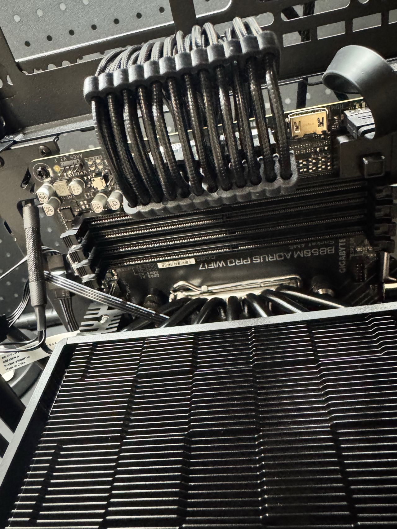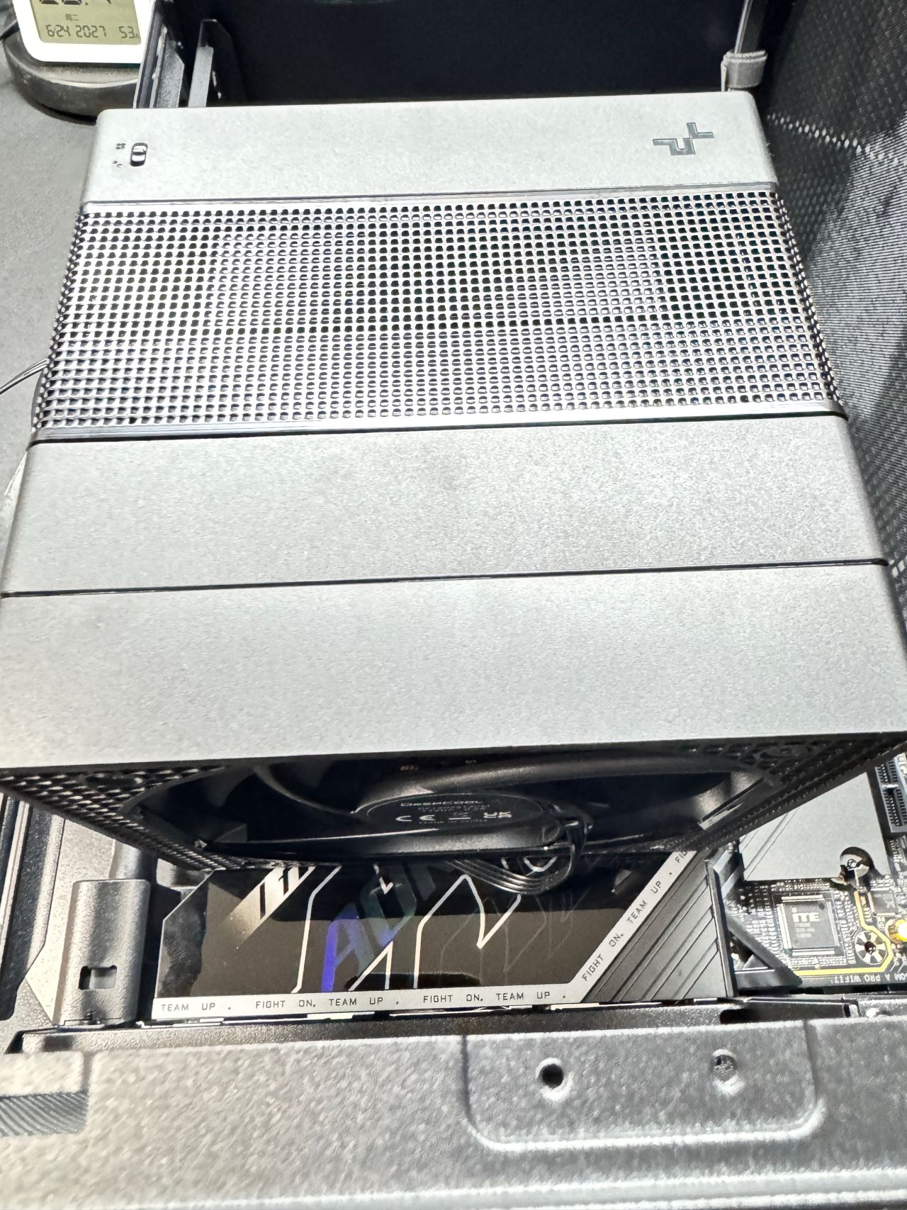 盒友使用的是5070TI显卡,显卡供电线,可以走显卡风扇面,不会与风扇打架,不建议5080以上显卡,显卡太厚,供电线无法走显卡风扇面。