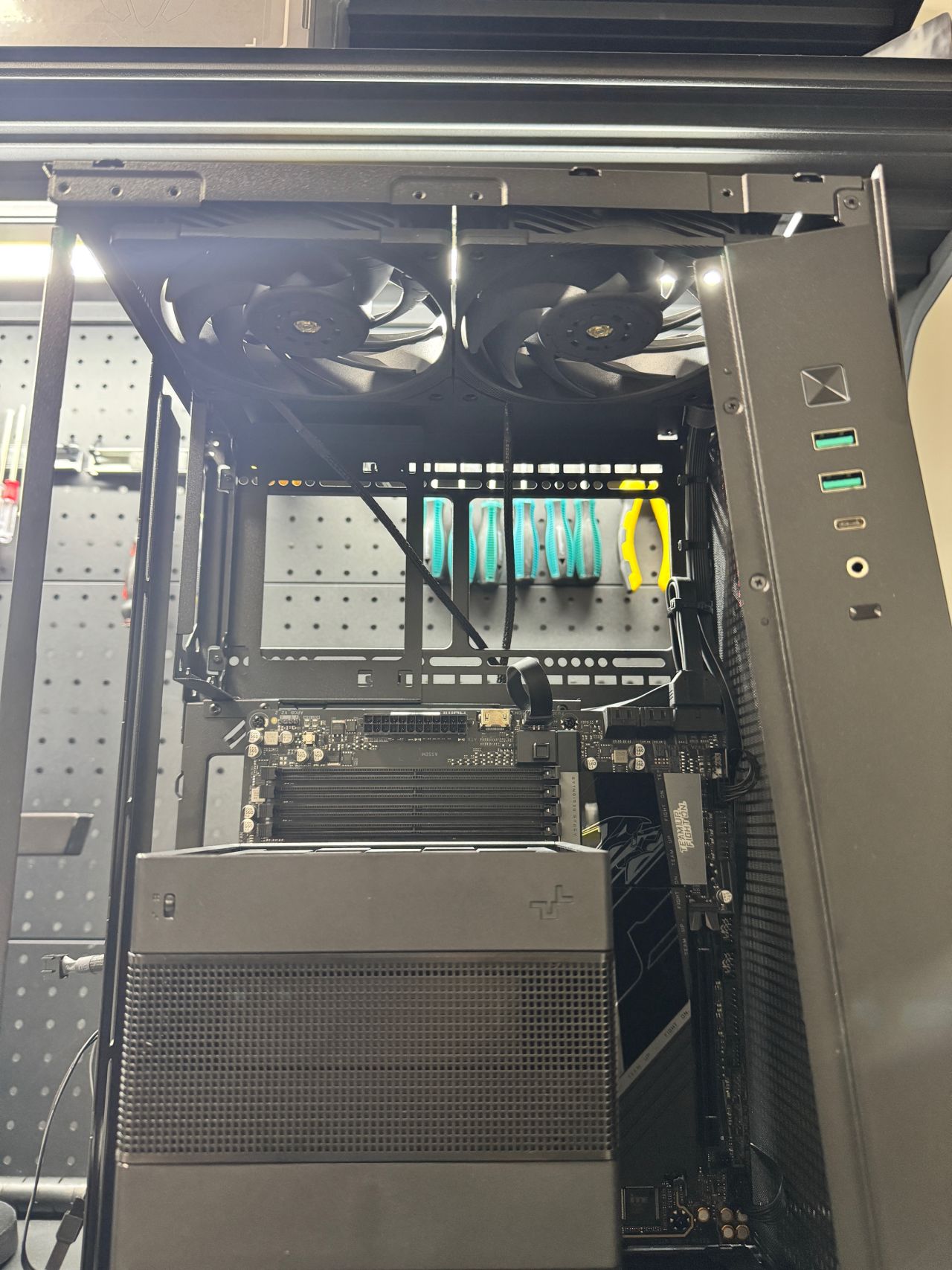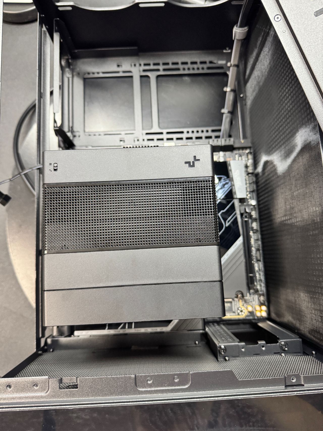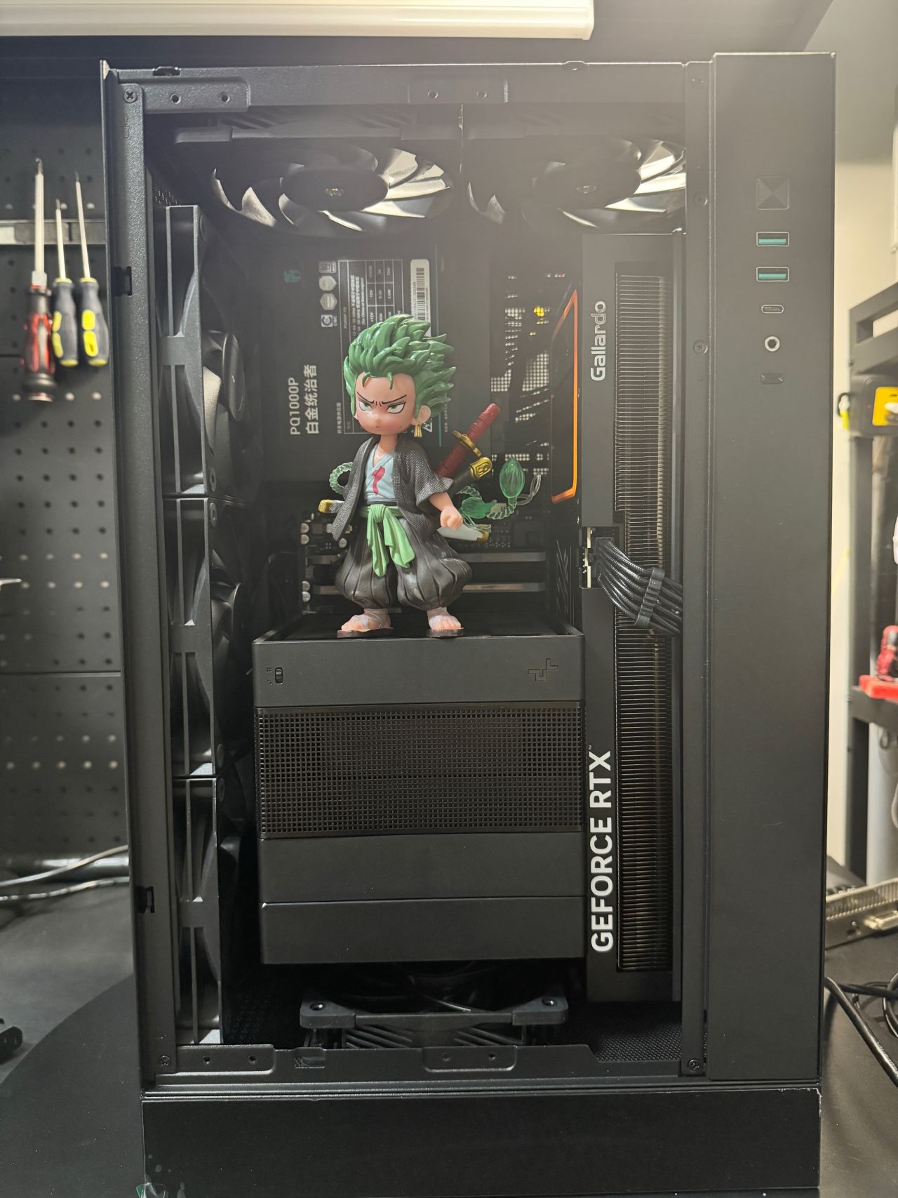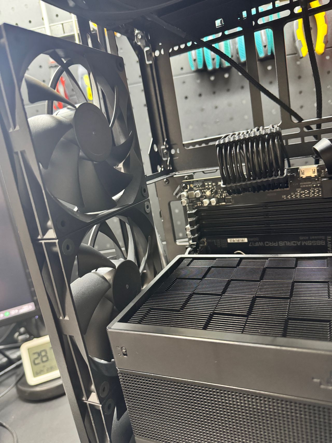 盒友使用的是5070TI显卡,显卡供电线,可以走显卡风扇面,不会与风扇打架,不建议5080以上显卡,显卡太厚,供电线无法走显卡风扇面。