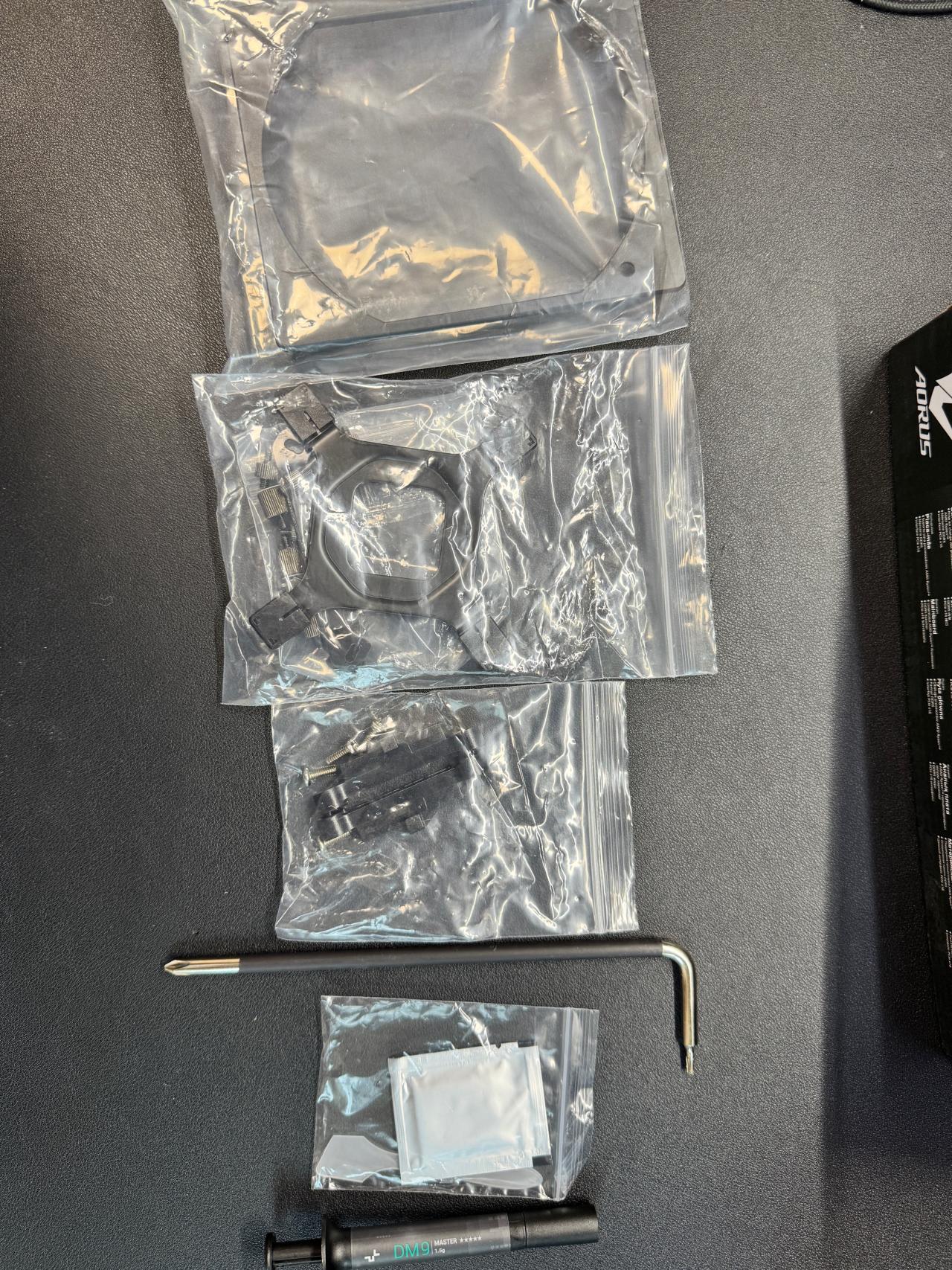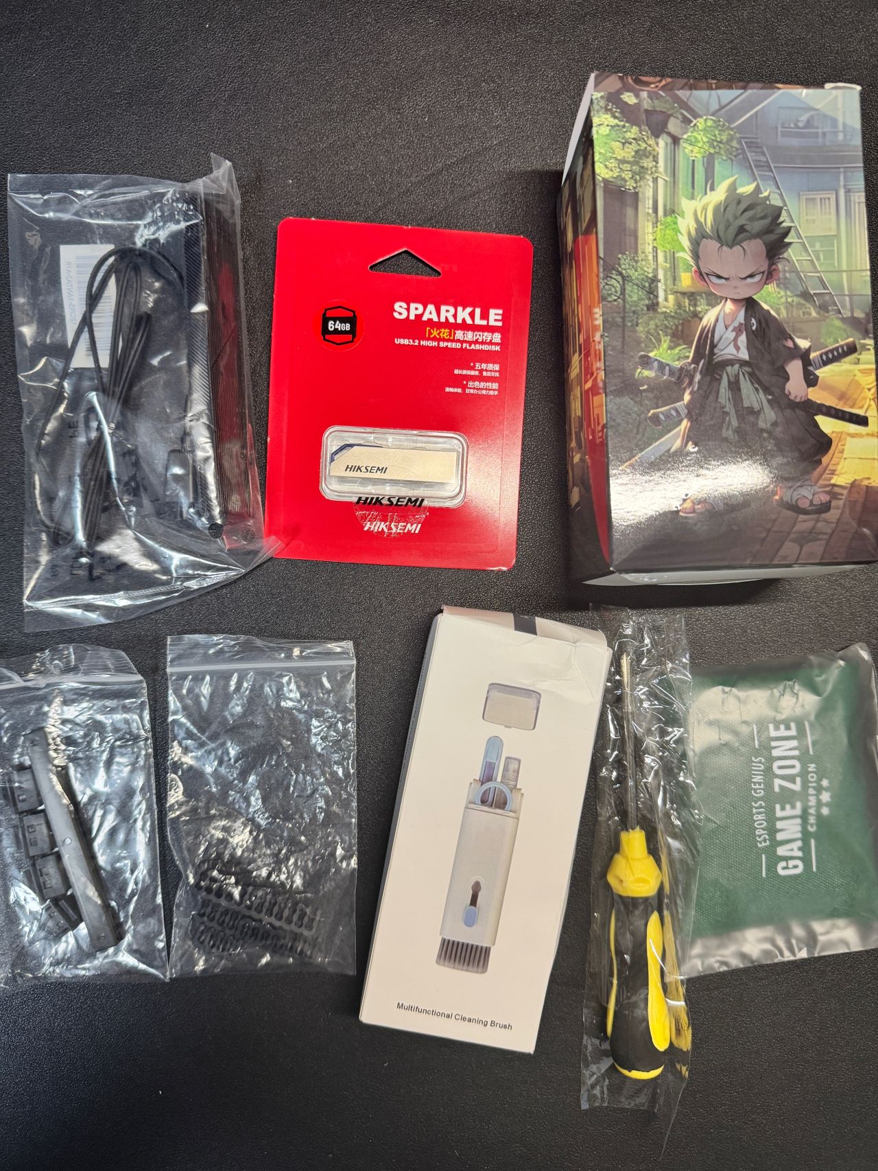 机箱剩余螺丝盒,Intel水冷扣具,机箱拆下的显卡挡板,剩余的模组线,原装扣具,未用完的硅脂,阿萨辛自带的螺丝刀和清洁布。